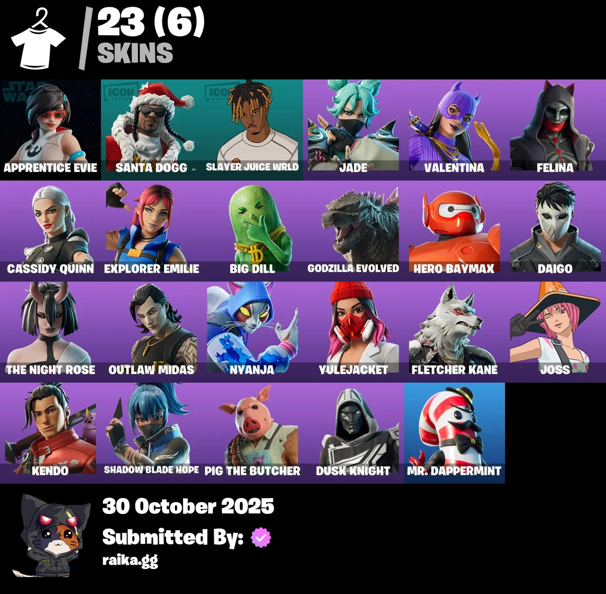 [PC/PSN/XBOX] 23 skins | Apprentice Evie | Santa Dogg | Slayer Juice WRLD | Jade | Valentina | Felina | Cassidy Quinn | Explorer Emilie | Big Dill | 200 VB