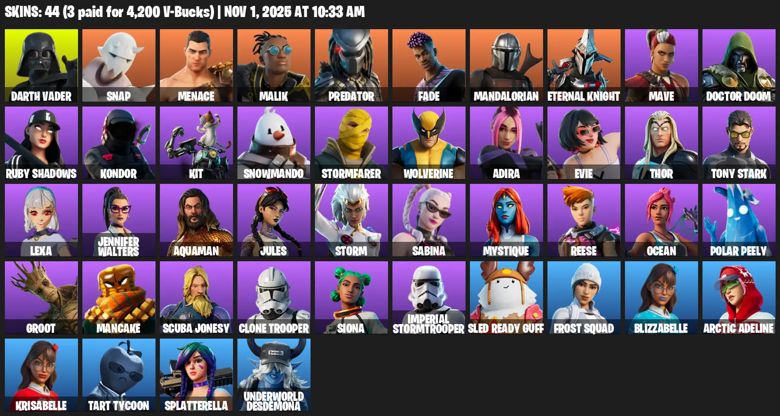 π¨ [PC/PSN/XBOX] π 44 skins | Darth Vader , Snap , Menace , Predator , Fade , Mandalorian , Eternal Knight , Mave , Doctor Doom | π 200 VBUCKS | βοΈ Changeable Email Now