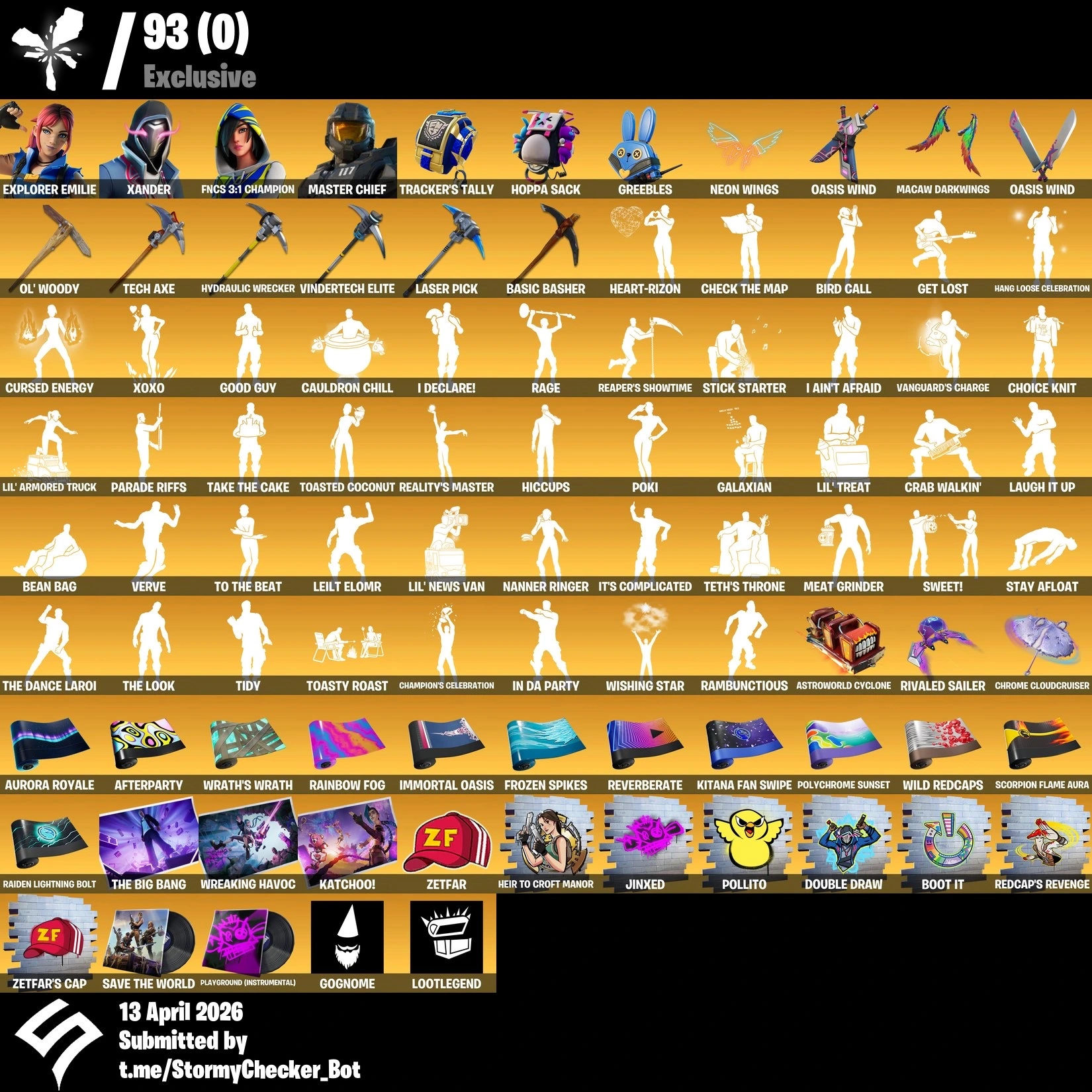 🔥 [🎮 PC/PSN/XBOX] ✨🔥 STACKED ACCOUNT 💎⭐ 755 Skins 🏆🎖️ Explorer Emilie 🧭 Xander 🕶️ FNCS 3:1 Champion 🏆 Master Chief (Black) ⚔️ Solid Snake 🐍 Oasis Wind 🌬️ Ol’ Woody 🤠 Tech Axe 🪓 GoGnome 🗿 LootLegend 💰 💰 6800 VB 💎🔥