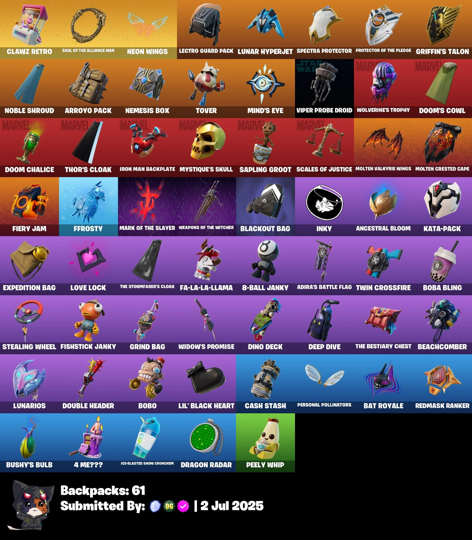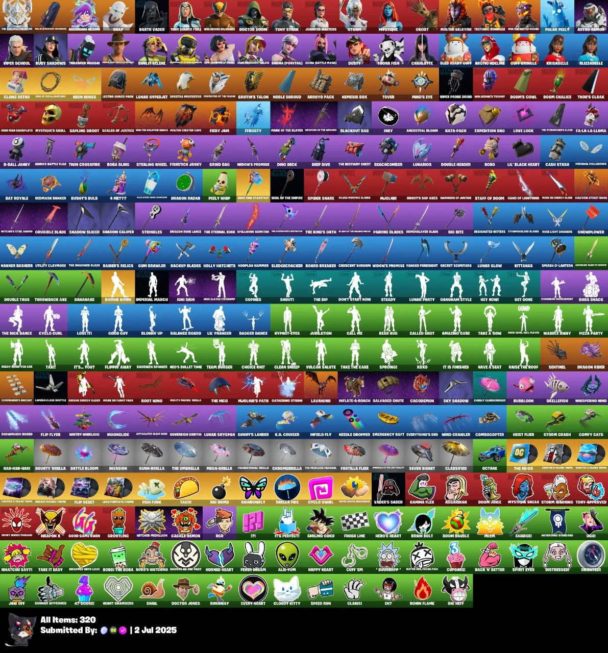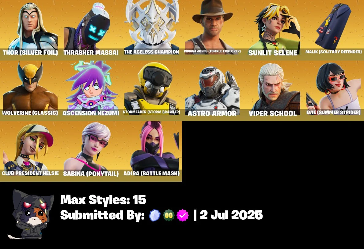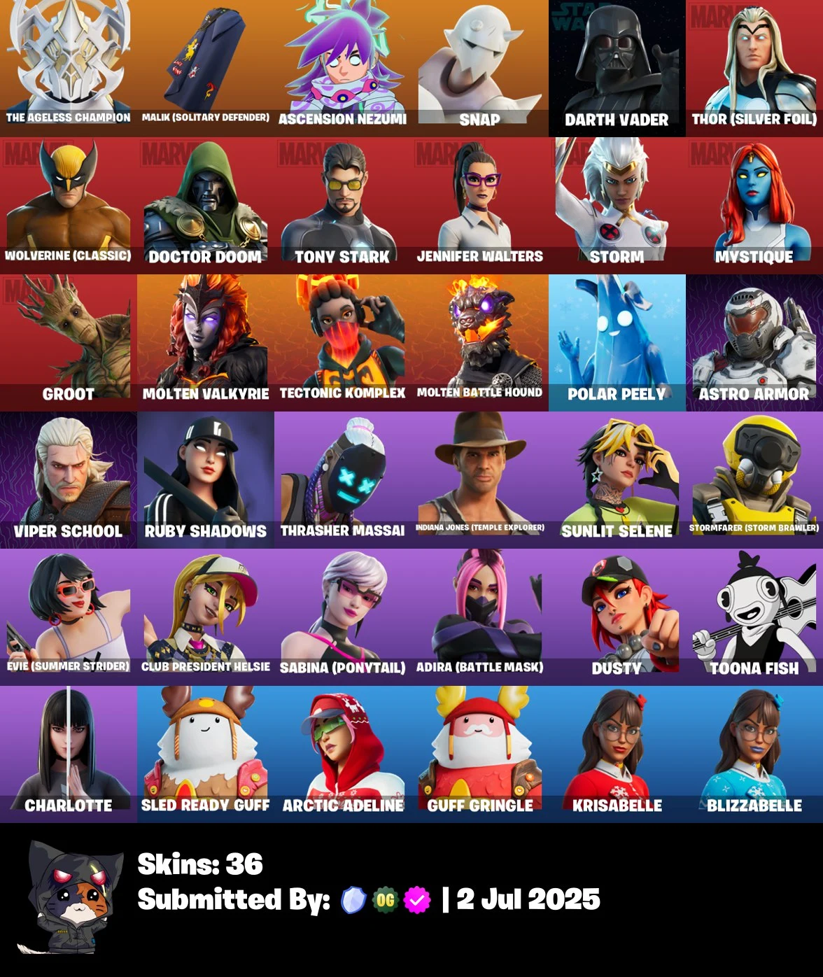 ⭐ [PC/PSN/XBOX/NINTENDO/MOBILE] 💠 36 SKINS 👑 THE AGELESS CHAMPION ⚔️ MALIK (SOLITARY DEFENDER) 🌟 ASCENSION NEZUMI 🎮 SNAP 🌑 DARTH VADER ⚡ THOR (SILVER FOIL) 🐺 WOLVERINE (CLASSIC) 🛡️ DOCTOR DOOM 💎 TONY STARK ✨ JENNIFER WALTERS 💰 100 VBUCKS 📧 FULL