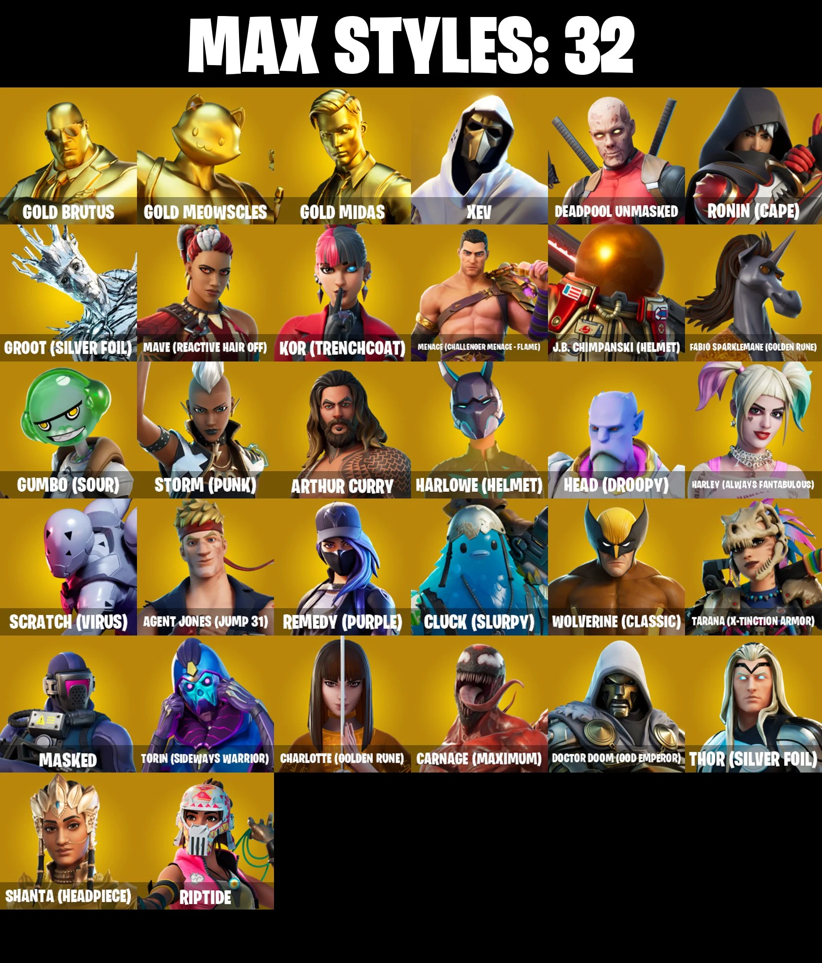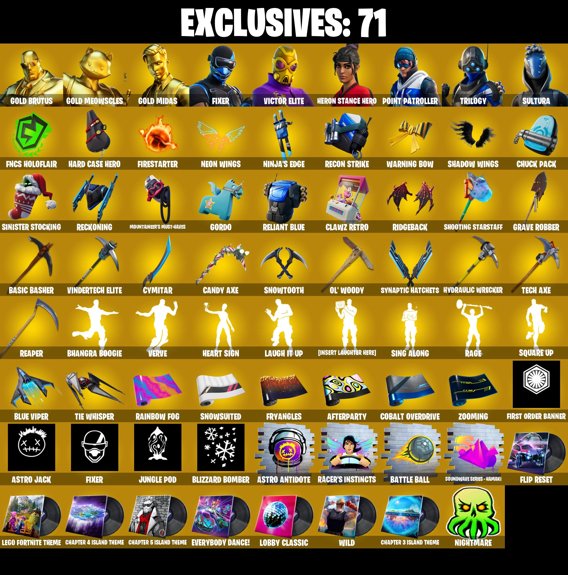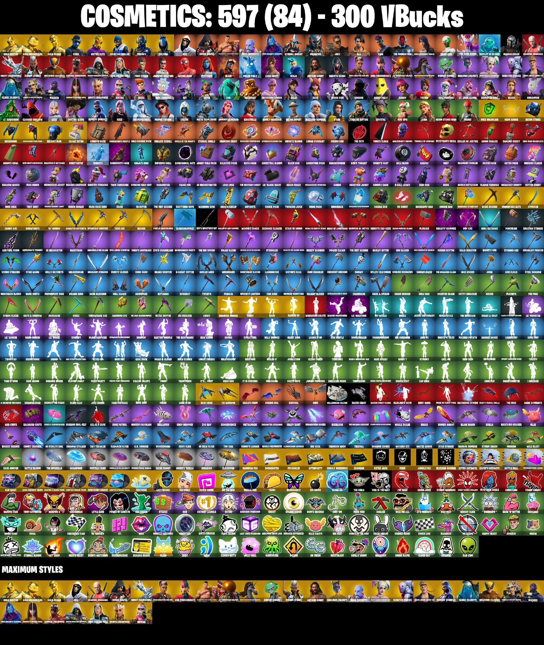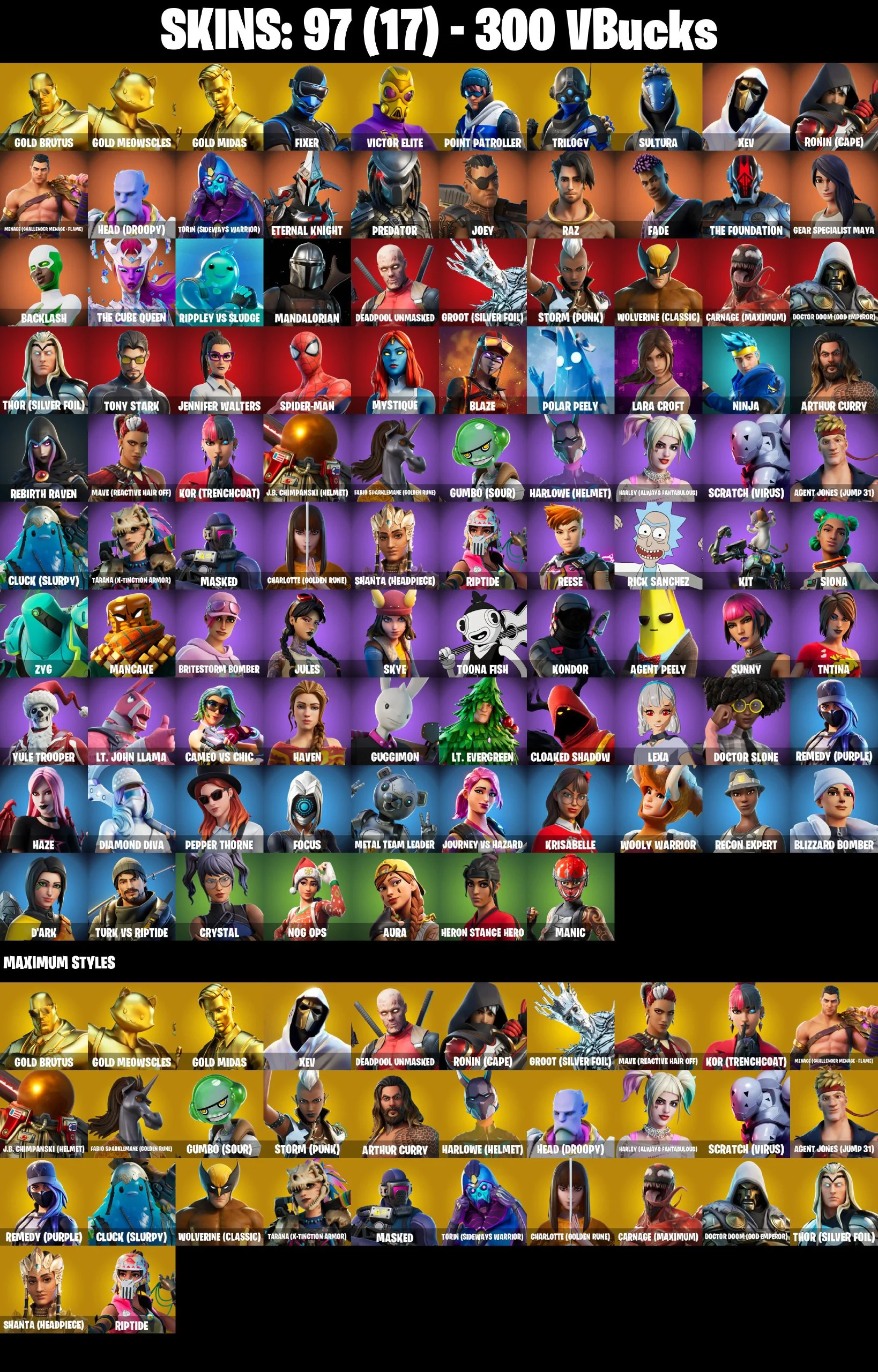 ⭐[PC/PSN/XBOX/NINTENDO/MOBILE] 97 SKINS | GOLD BRUTUS | GOLD MEOWSCLES | GOLD MIDAS | FIXER | VICTOR ELITE | POINT PATROLLER | TRILOGY | SULTURA | XEV | RONIN (CAPE) | MENACE (CHALLENGER MENACE ⸱ FLAME) | HEAD (DROOPY)