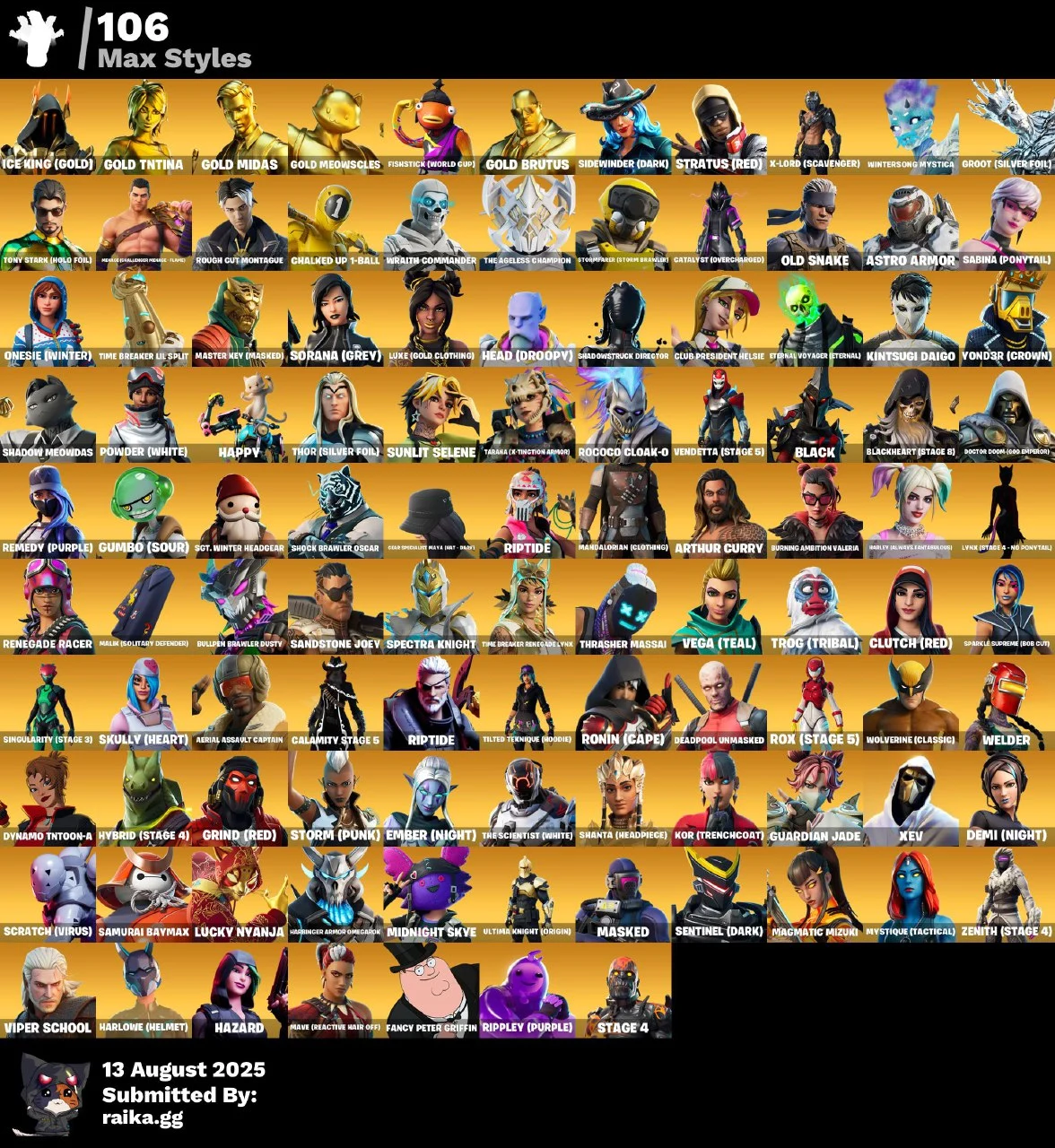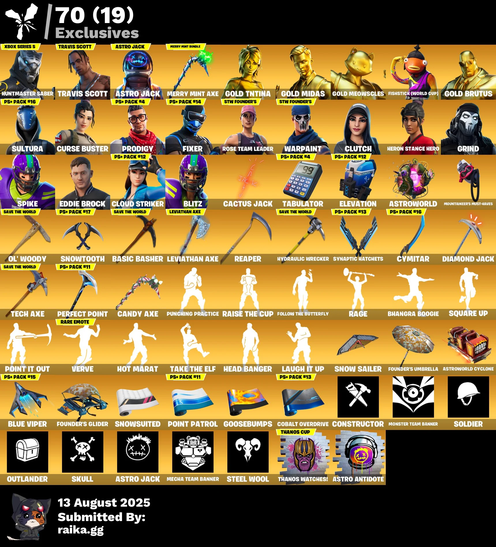 [PC/PS/XBOX] 377 Skins ✔ OG STW ✔ Huntmaster Saber ✔ Travis Scott ✔ Astro Jack ✔ Gold TNTina ✔ Gold Midas ✔ Gold Meowscles ✔ 65 VB