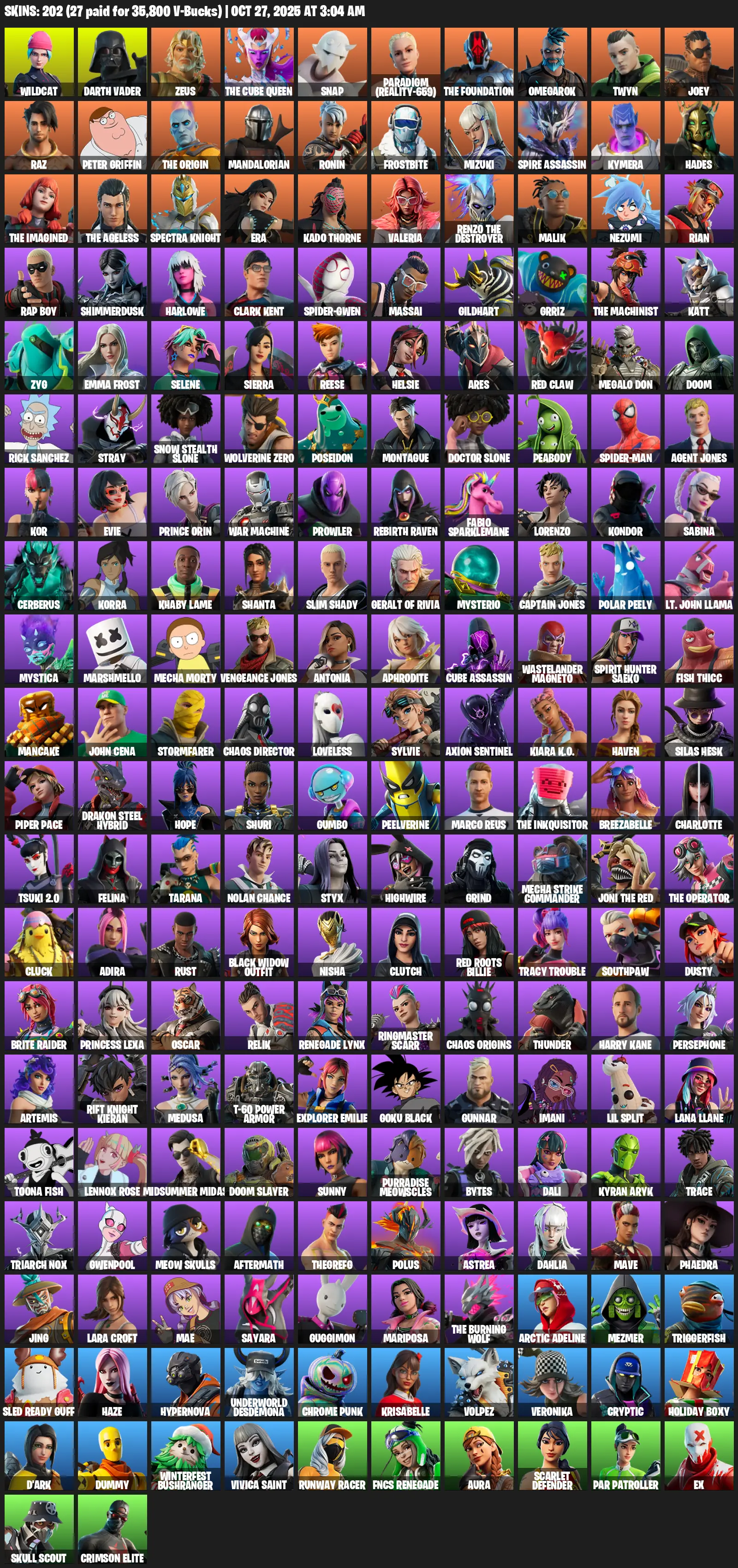 [PC/XBOX/PSN] 202 Skins | Wildcat | Darth Vader | Zeus | The Cube Queen | Snap | Paradigm (Reality-659) | The Foundation | Omegarok | Twyn | Joey | Raz | Peter Griffin | The Origin | Mandalorian | Ronin | Frostbite | Mizuki | Spire Assassin | Kymera