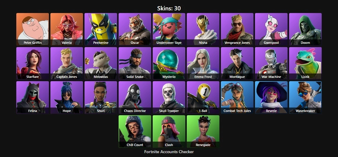 PC/XBOX/PSN 30 Skins⚡ | Skull Trooper | Renegade | Peter Griffin | Valeria | Peelverine | Oscar | Undercover Skye | Nisha | Vengeance Jones | Gwenpool | Doom