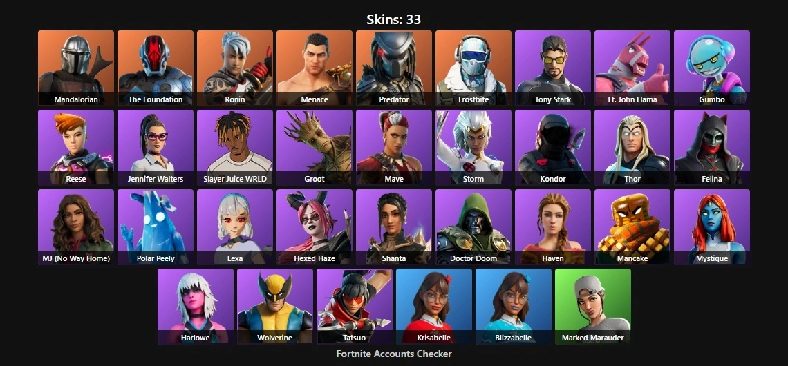 PC/XBOX/PSN 33 Skins⚡ | Mandalorian | The Foundation | Ronin | Menace | Predator | Frostbite | Tony Stark | Lt. John Llama | Gumbo | Reese | Jennifer Walters