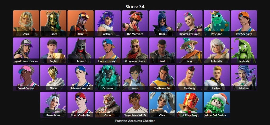 PC/XBOX/PSN 34 Skins⚡ | Zeus | Hades | Blaze | Artemis | The Machinist | Hope | Ringmaster Scarr | Poseidon | Trey Specialist | Spirit Hunter Saeko | Bugha