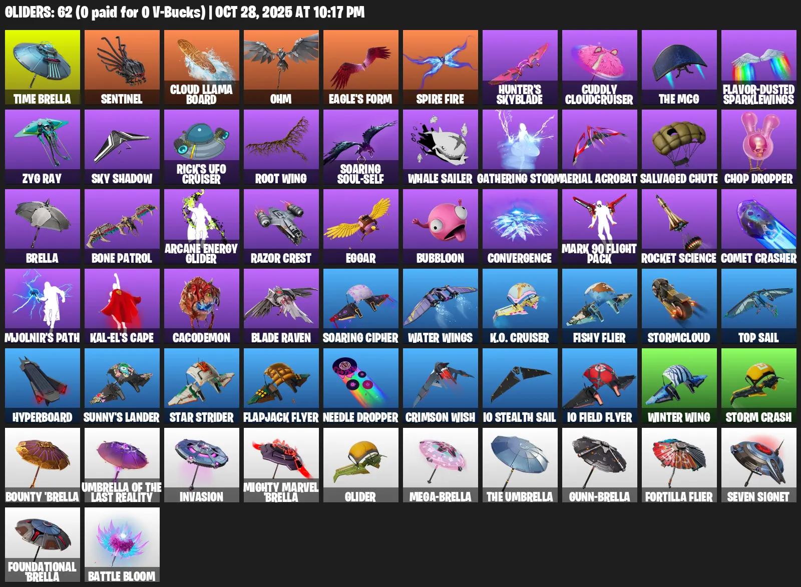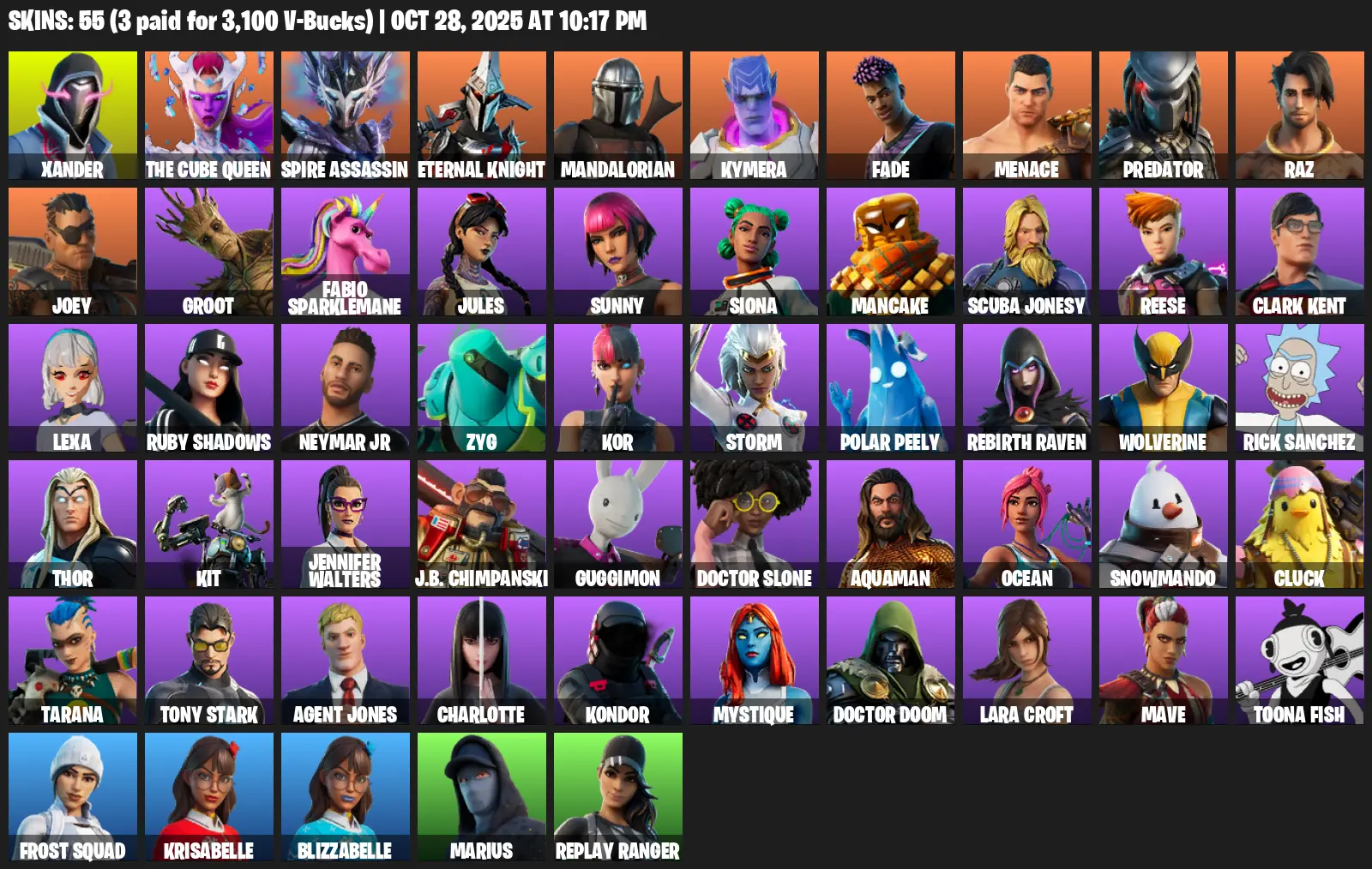[PC/XBOX/PSN] 55 Skins | Xander | The Cube Queen | Spire Assassin | Eternal Knight | Mandalorian | Kymera | Fade | Menace | Predator | Raz | Joey | Groot | Fabio Sparklemane | Jules | Sunny | Siona | Mancake | Scuba Jonesy | Reese | Clark Kent | Lexa
