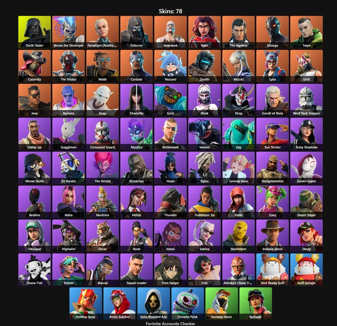 PC/XBOX/PSN 78 Skins⭐️ | Darth Vader | Omega | Renzo the Destroyer | Paradigm (Reality-659) | Enforcer | Ragnarok | Valor | The Ageless | Twyn | Calamity