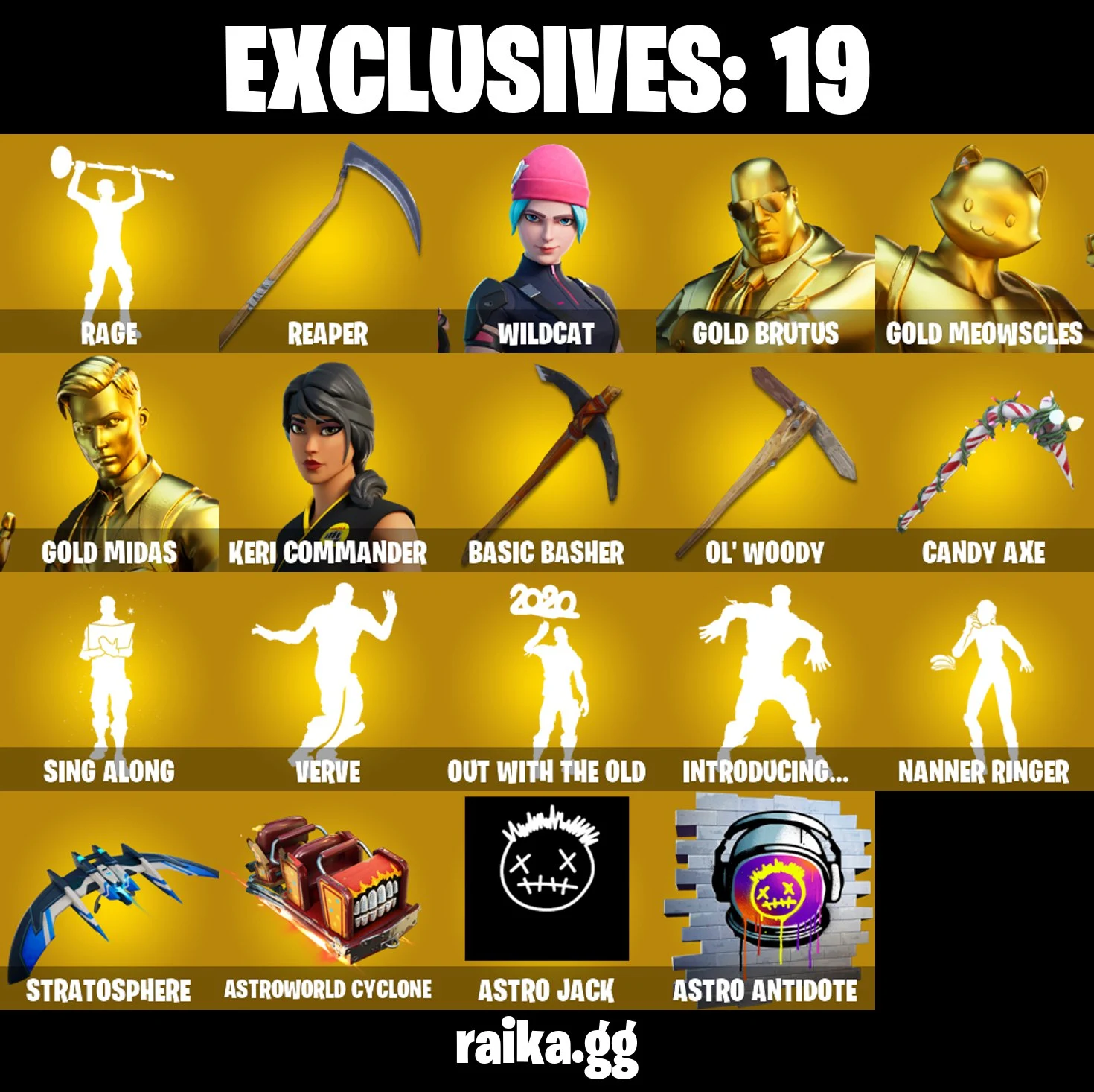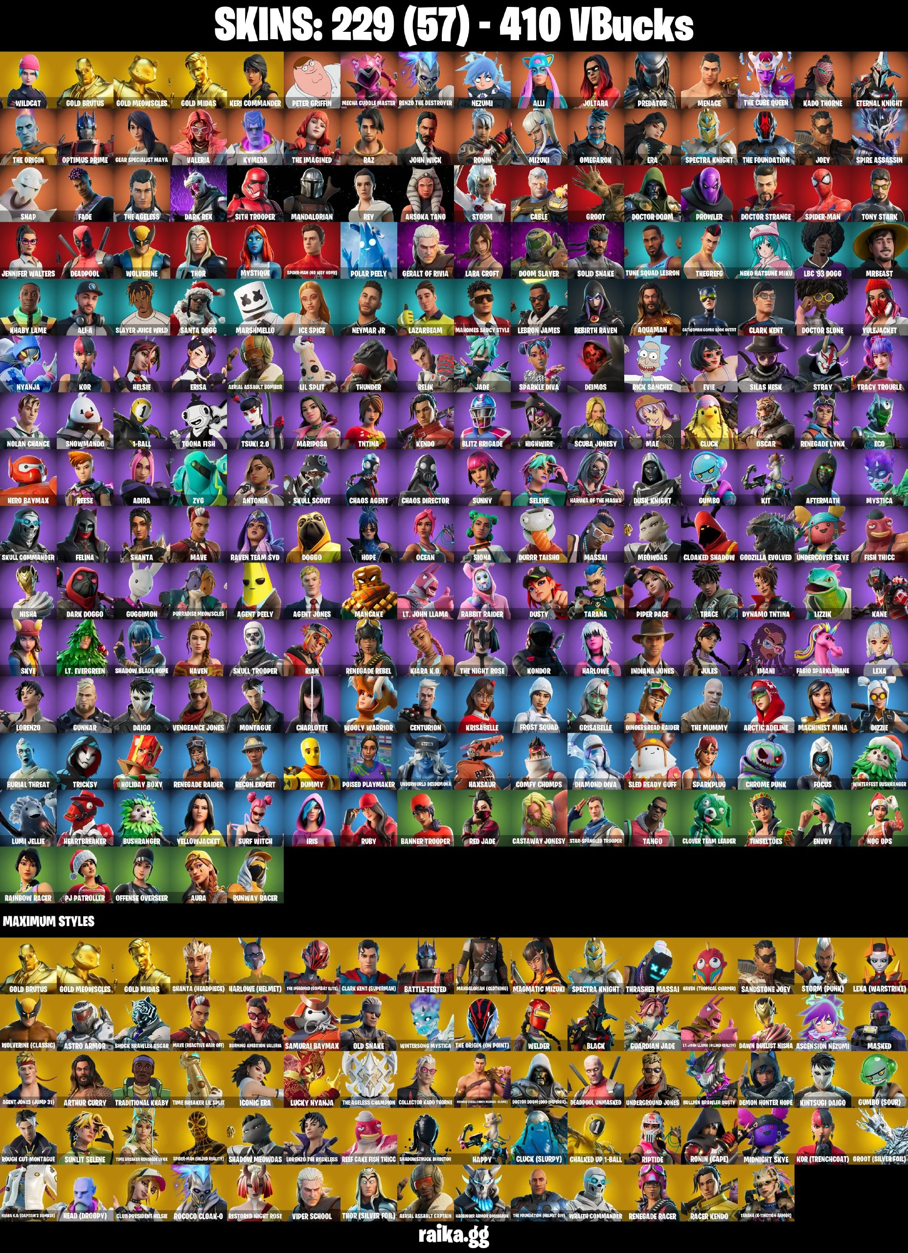 πβ¨STACKED EXCLUSIVEβ¨π 229 SKINS π WILDCAT π JOHN WICK π RAGE π AGENT PEELY π TONY STARK π SKULL TROOPER π REAPER π WILDCAT π RENEGADE RAIDER π GOLD BRUTUS π GOLD MEOWSCLES π GOLD MIDAS π KERI COMMANDER π PETER GRIFFIN π 410 VBUCKS β‘οΈPC/PSN/XBOXβ‘οΈ