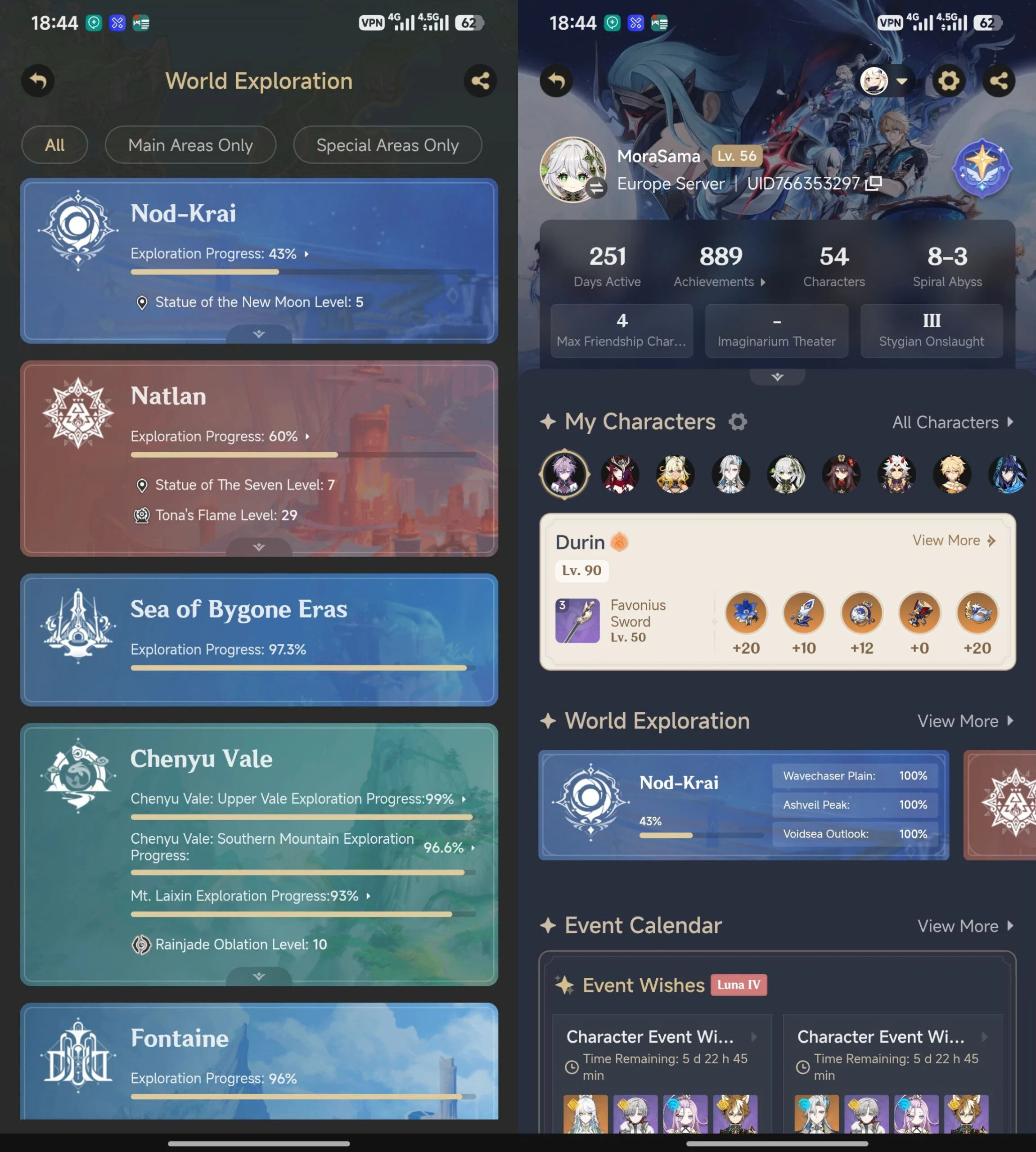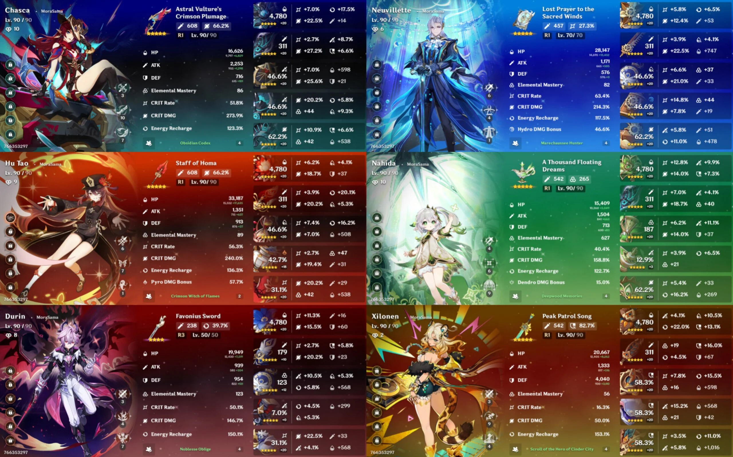 All Platform 🎮 EU 🇪🇺 AR 56 🛍️ 54 Character 15 5'Star 💯 7 Weapon 5'Star 🎖️ Chasca 🗿 Durin 🔫 Neuvillette 🔥 Hu Tao 🎖️ Nahida 🛡️ Code1436