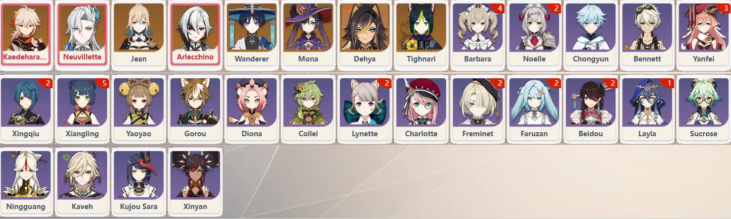 [EU]AR47|Five Stars*8[Arlecchino+Neuvillette+Kaedehara Kazuha+Wanderer+Jean+Mona+Dehya+Tighnari] Four stars*22|For detailsplease see the description and picture