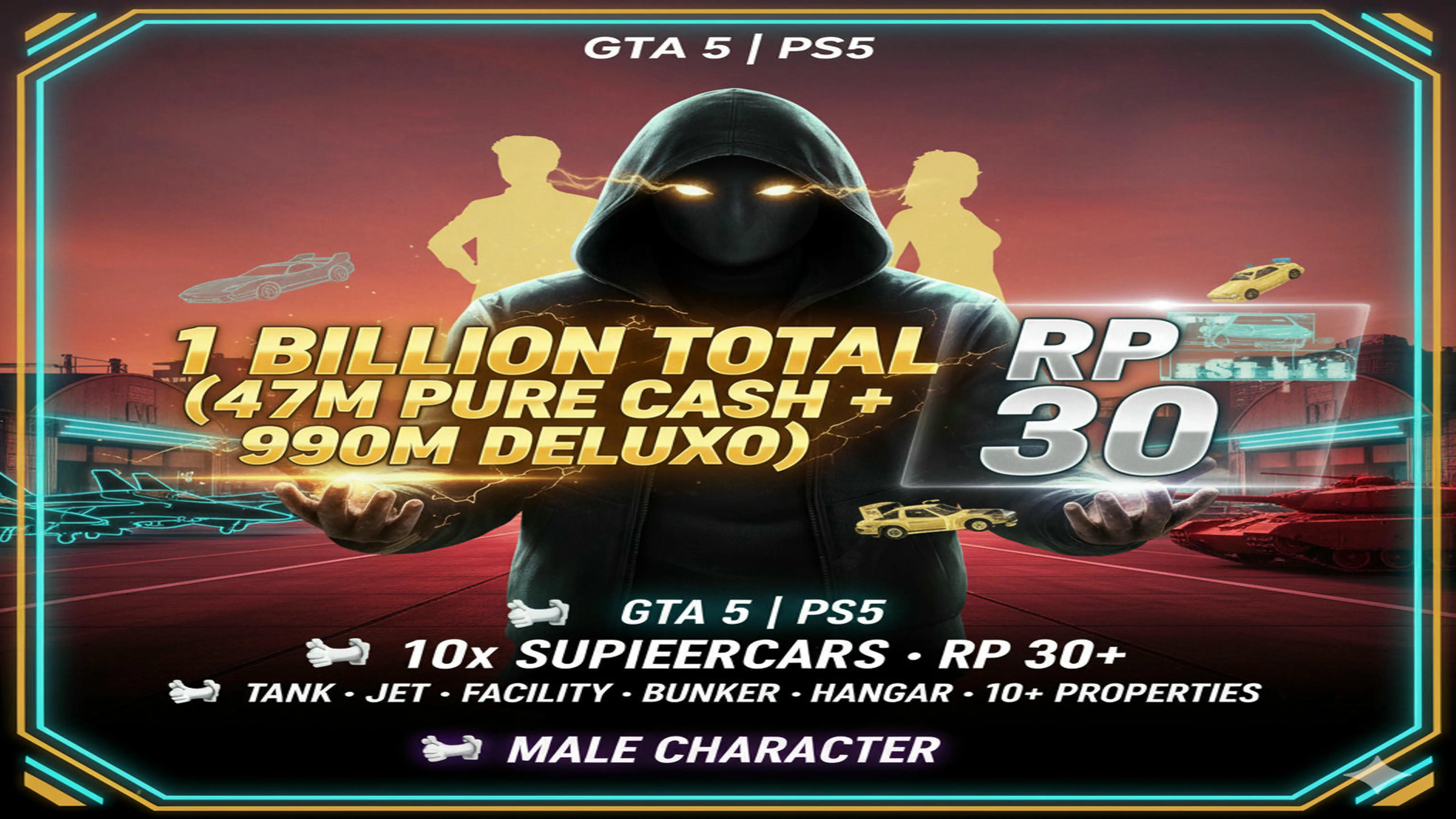 🥩 Legit 🥩 GTA 5 | PS5 🥩 1 Billion Total ( 48 Million Pure Cash + 990 Million Worth Deluxo ) 🥩 10x Supercars 🥩 RP 30 🥩 Tank 🥩 Jet 🥩 Facility 🥩 Bunker 🥩 Hangar 🥩 10+ Properties 🥩 Male + Female Dual Character 🥩 #FoNeJ1