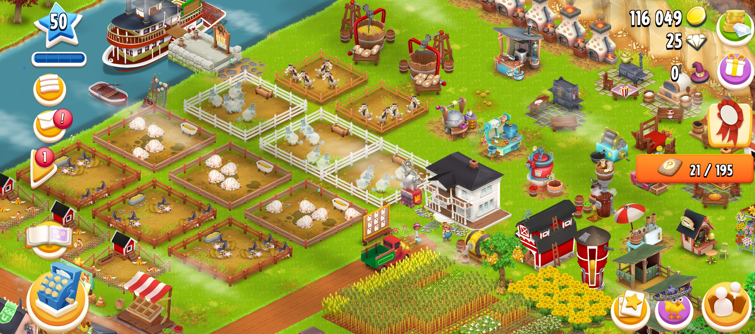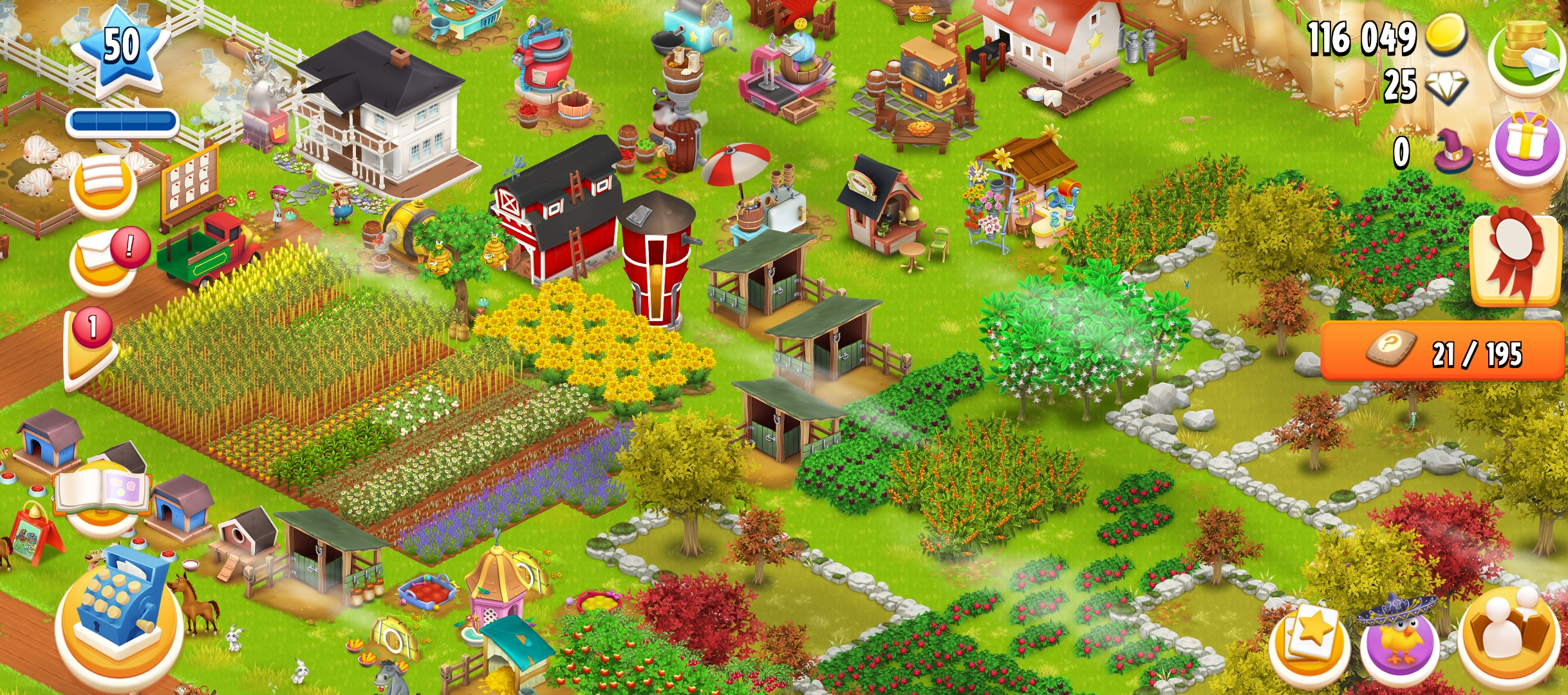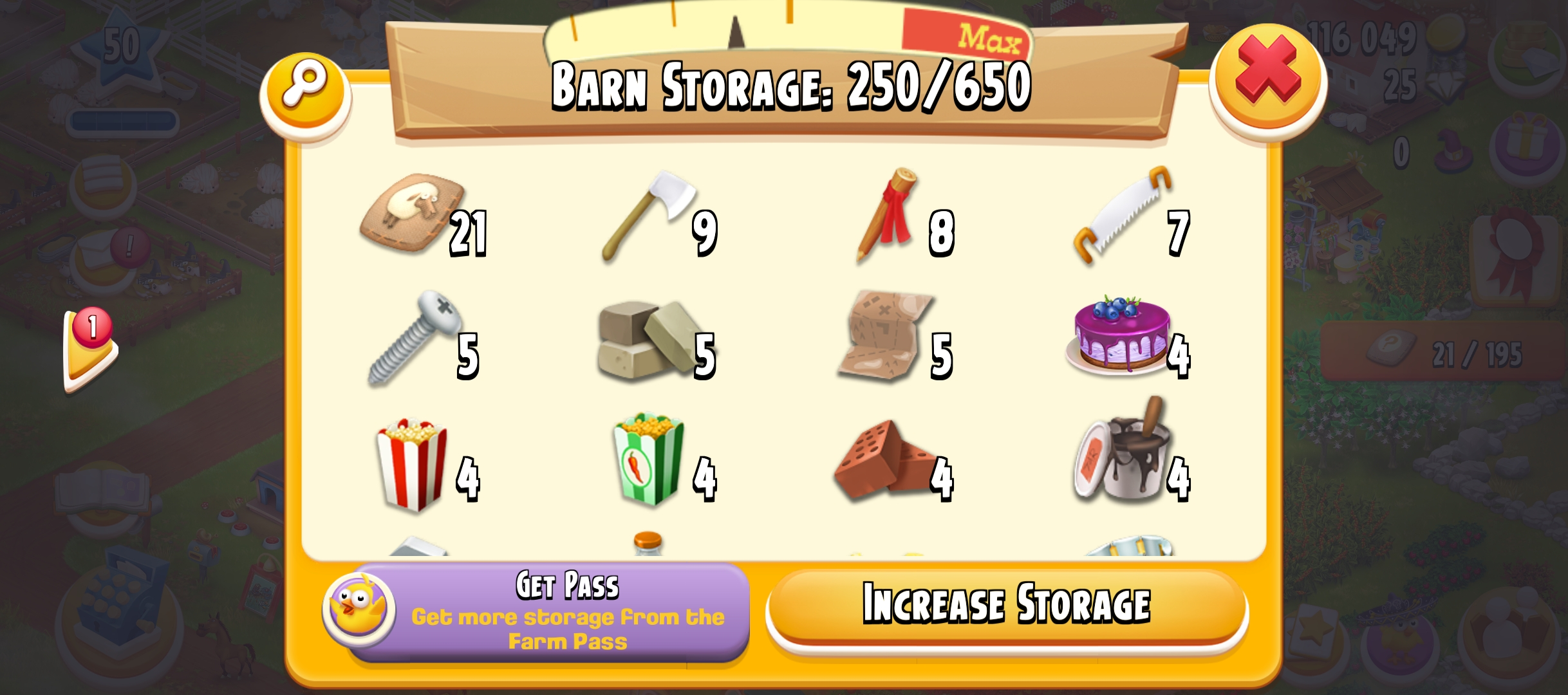 50 level | 650 Barn Storage | 600 silo storage | 100k Coin | 25 gems