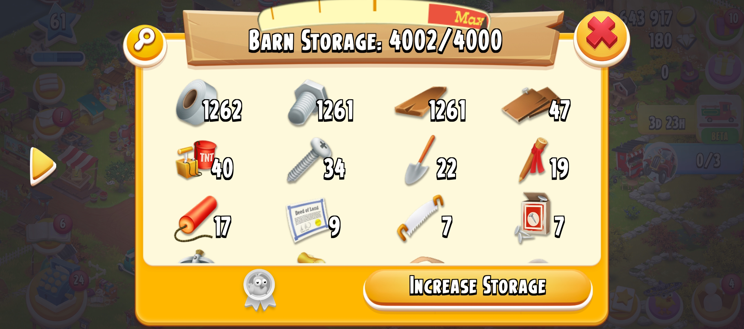 60 level | Barn Tools farm | Barn Storage 4000 | Silo Storage 1000 | 2.5M Coin | 50 gems | barn items