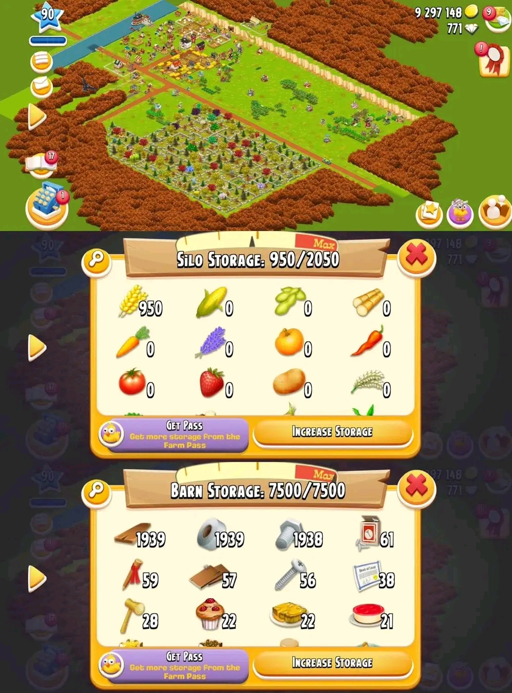 90 level | Barn Storage 7500 | Silo Storage 2000 | 8M Coin | 600 Gems | Android & Ios