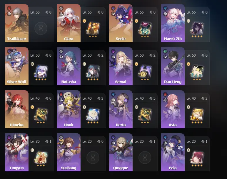 ๐ NA Server | ๐ฏ TL 44 | ๐ 16 Characters  4 Legendaries | ๐ซ Clara, Seele, Silver Wolf, Himeko | ๐น Trailblazer, Natasha, Dan Heng, March 7th, Herta, Pela, Serval, Asta, Tingyun, Hook, Sushang, Qingque