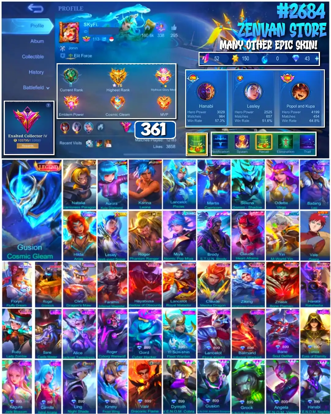 #2684 🔥 361 Skins 🔥 Legend Gusion 🔥 Collector Natalia 🔥 Stun Brody 🔥 M-World Yin 🔥 Transformers Roger 🔥 KoF Karina & Aurora 🔥 Many Limited 🔥 Many Zodiak 🔥 Many Epic 🔥 Safe Account ✅