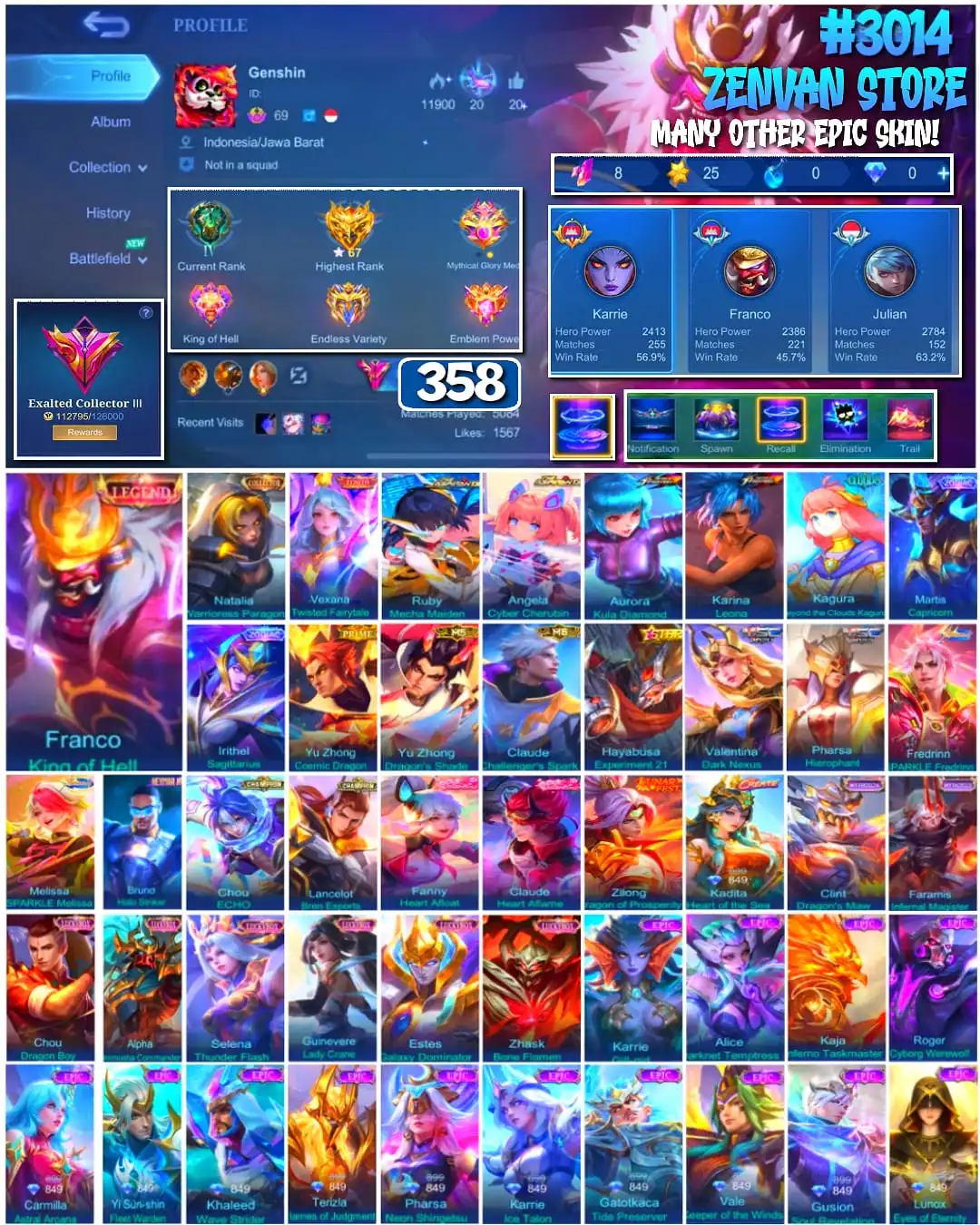 #3014 🔥 358 Skins 🔥 Legend Franco 🔥 Collector Natalia 🔥 Zenith Vexana 🔥 Aspirant Ruby, Angela 🔥 Clouds Kagura 🔥 Prime Yu Zhong 🔥 KoF Karina, Aurora 🔥 Many Limited 🔥 Many Epic 🔥 Safe Account ✅