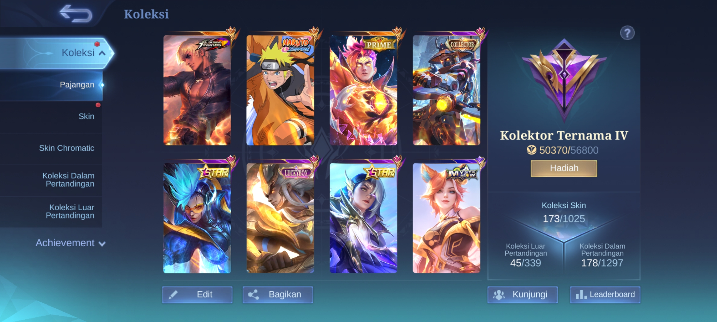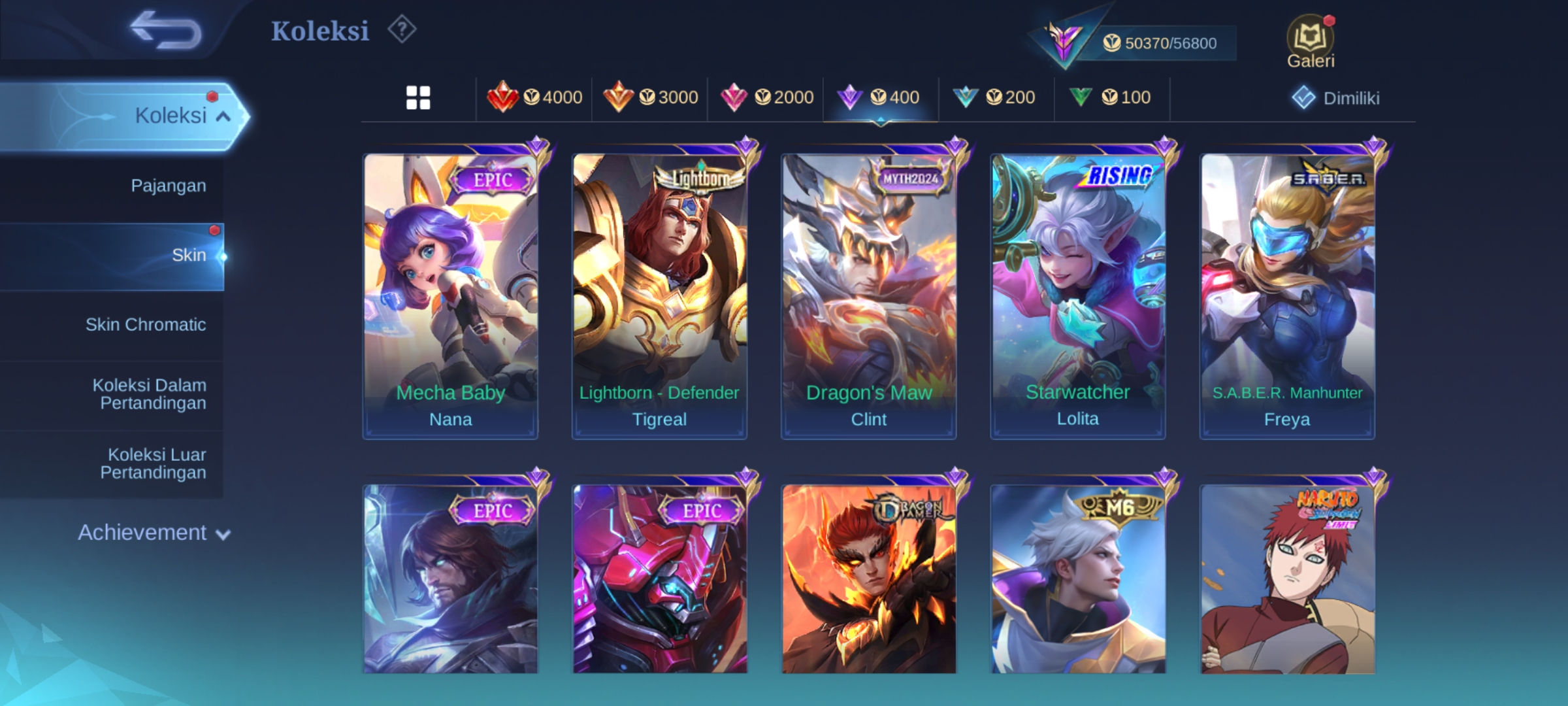 ML-398 Skins 173 [ Magic Core 132 ] Naruto Lucas / KOF Gusion / Collector YSS / Prime Claude / Anual Lesley x Anual Karrie