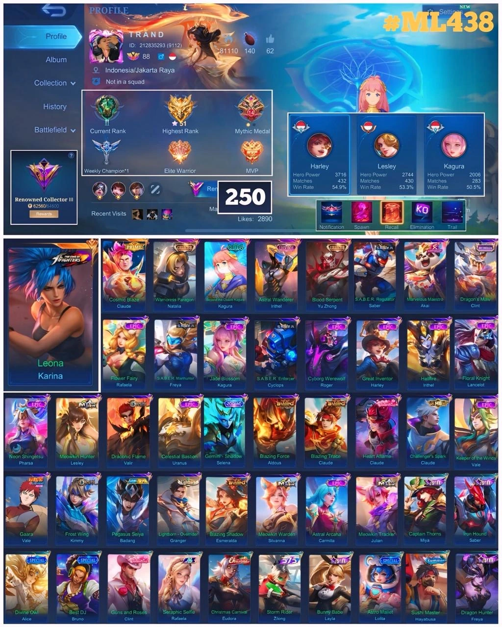 ML 438⚡Full max emblem⚡️Skins 250⚡️Hero 129⚡️Kof Karina⚡️Prime Claude⚡️Collector Natalia Yuzhong⚡️Clouds Kagura⚡️Luckybox Irithel⚡️Saber⚡️Myth Clint⚡️10 Epic⚡️Mystic Lesley⚡️Dragon Valir⚡️Zodiac Selena⚡️Blazing Aldous Claude⚡️Seint Badang⚡️