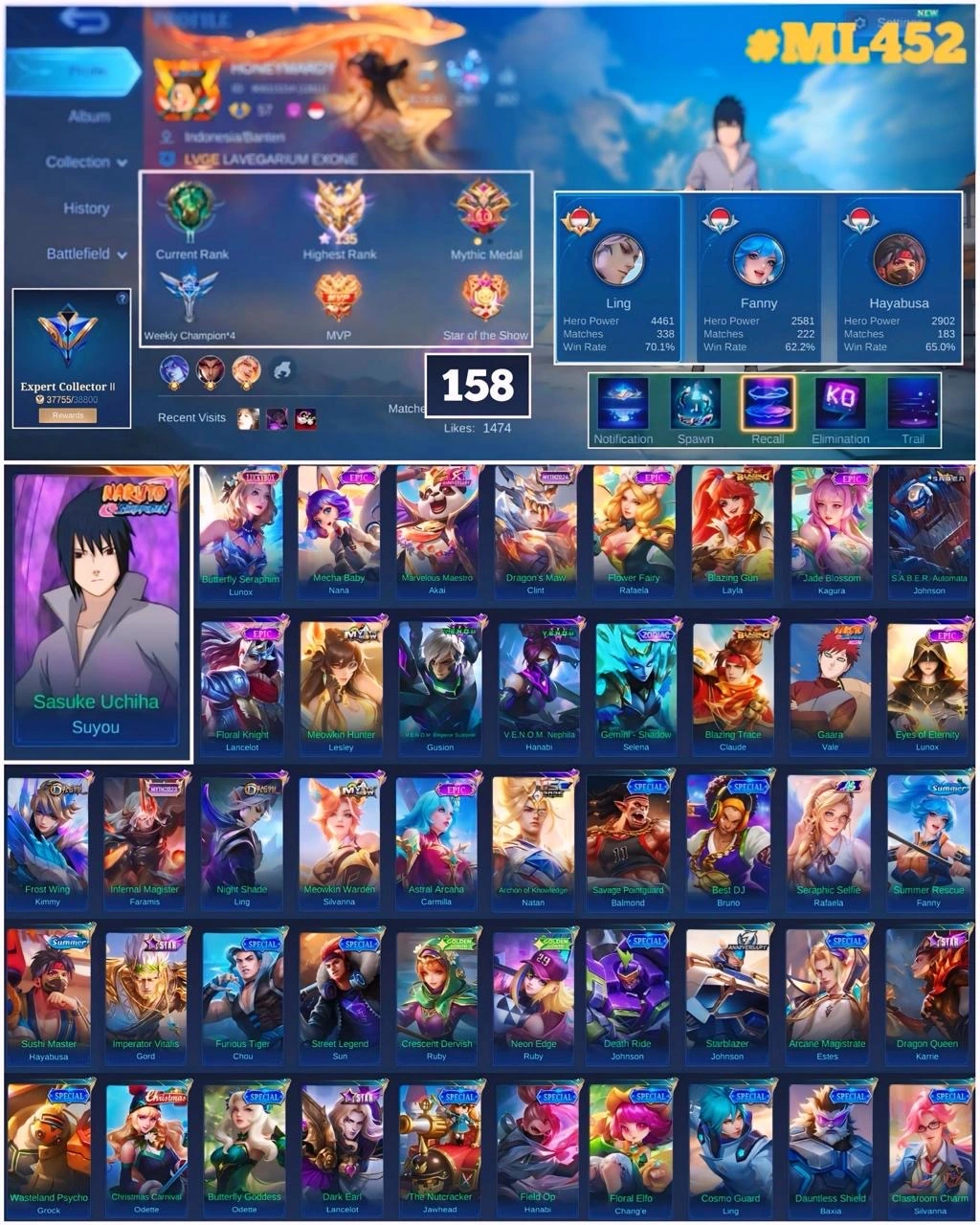 ML 452⚡Full max emblem⚡️Skins 158⚡️Hero 80⚡️ Naruto Suyou⚡️Luckybox Lunox⚡️6 Epic⚡️Myth Clint ⚡️Blazing Layla Claude⚡️Mystic Lesley⚡️Venom Gusion Hanabi⚡️Zodiac Selena⚡️Naruto Vale⚡️Dragon Kimmy Ling⚡️
