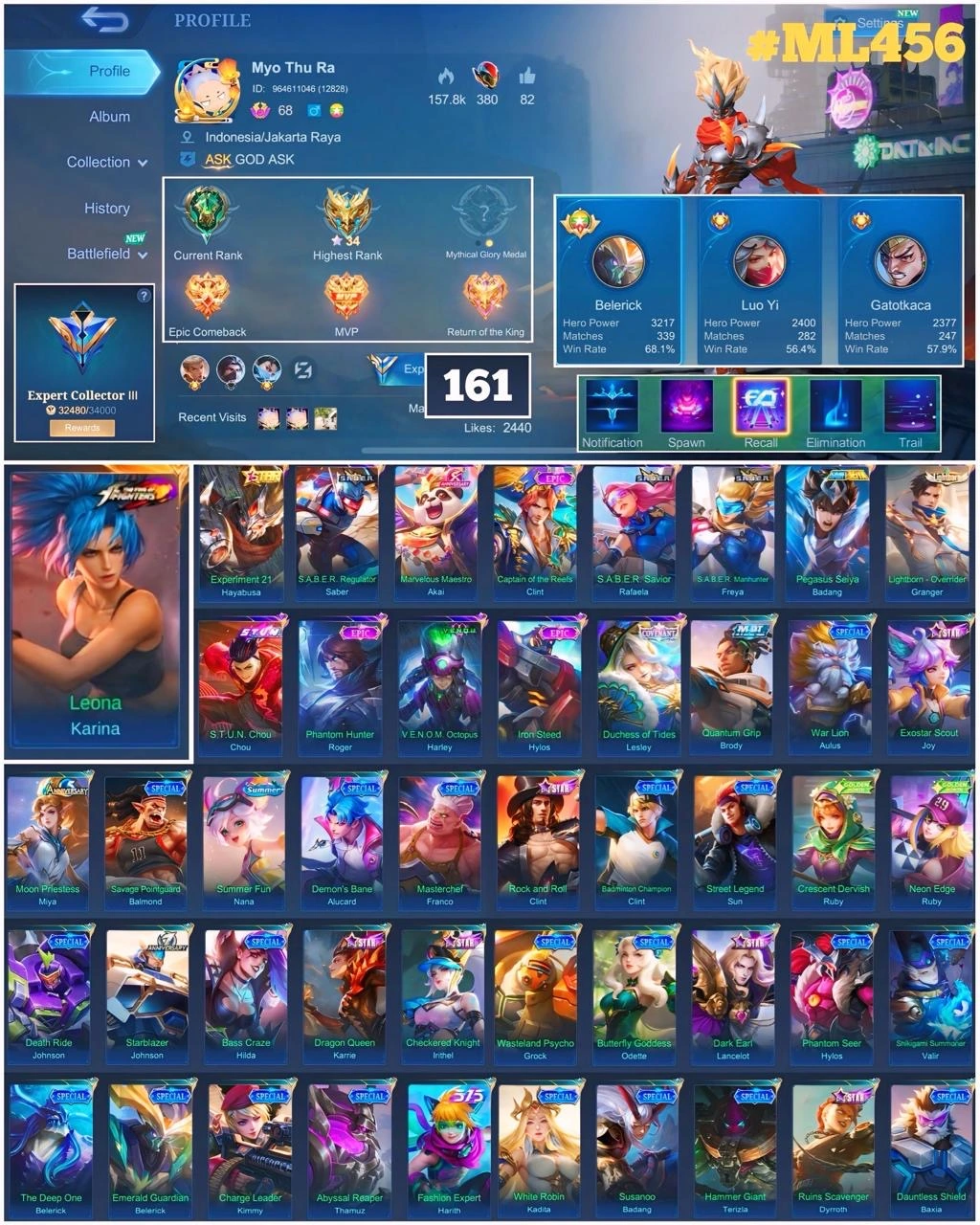 ML 456⚡Full max emblem⚡️Skins 161⚡️Hero 120⚡️Kof Karina⚡️Star Hayabusa⚡️Saber Rafaela Freya⚡️Seint Badang⚡️Epic Clint Roger Hylos⚡️Covenant Lesley⚡️Lightborn Granger⚡️Stun Chou⚡️Venom Harley⚡️