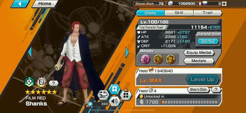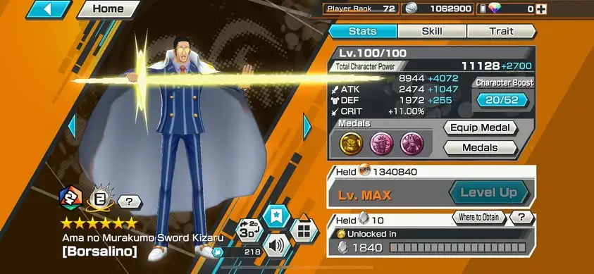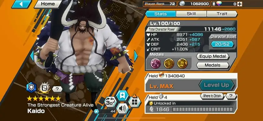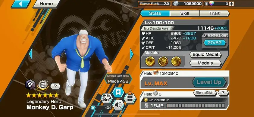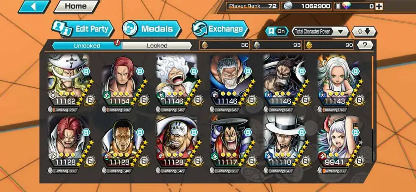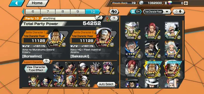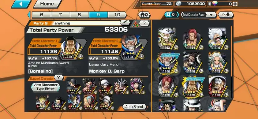 [3338][IOS+ANDROID] 13 EX META / HB 67 / Garp + Kizaru + Akainu + Whitebeard + Shanks Light + Lucci + Kaido + S-Snake + Luffy G5 + Shanks Red + Oden + Yamato + Shanks Blue , Support 167% , Best Medal
