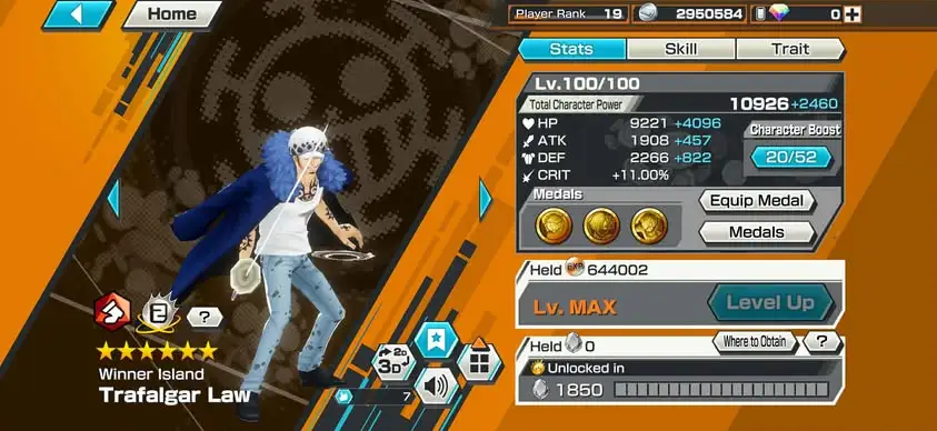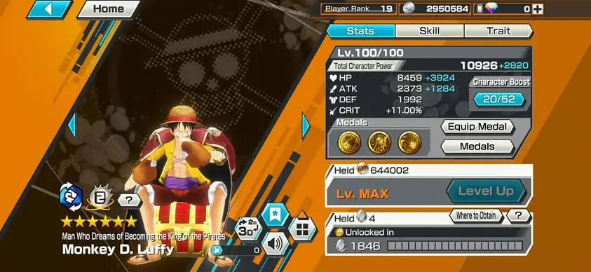 [4183][IOS+ANDROID] 4 EX META MAX / Luffy Blue + Law + Nusjuro + Kaido Hybrid , 1933 fragments , Support 143% , Good Medal