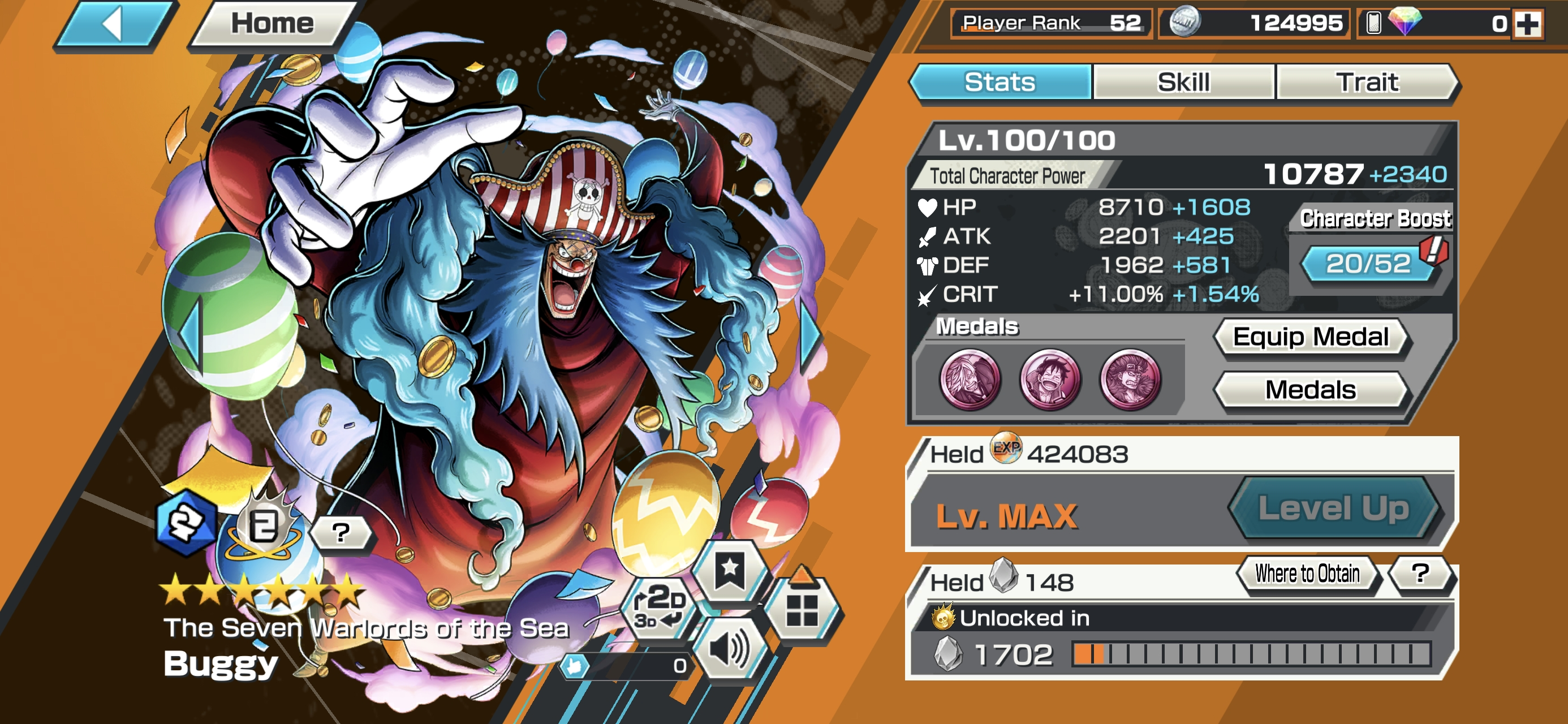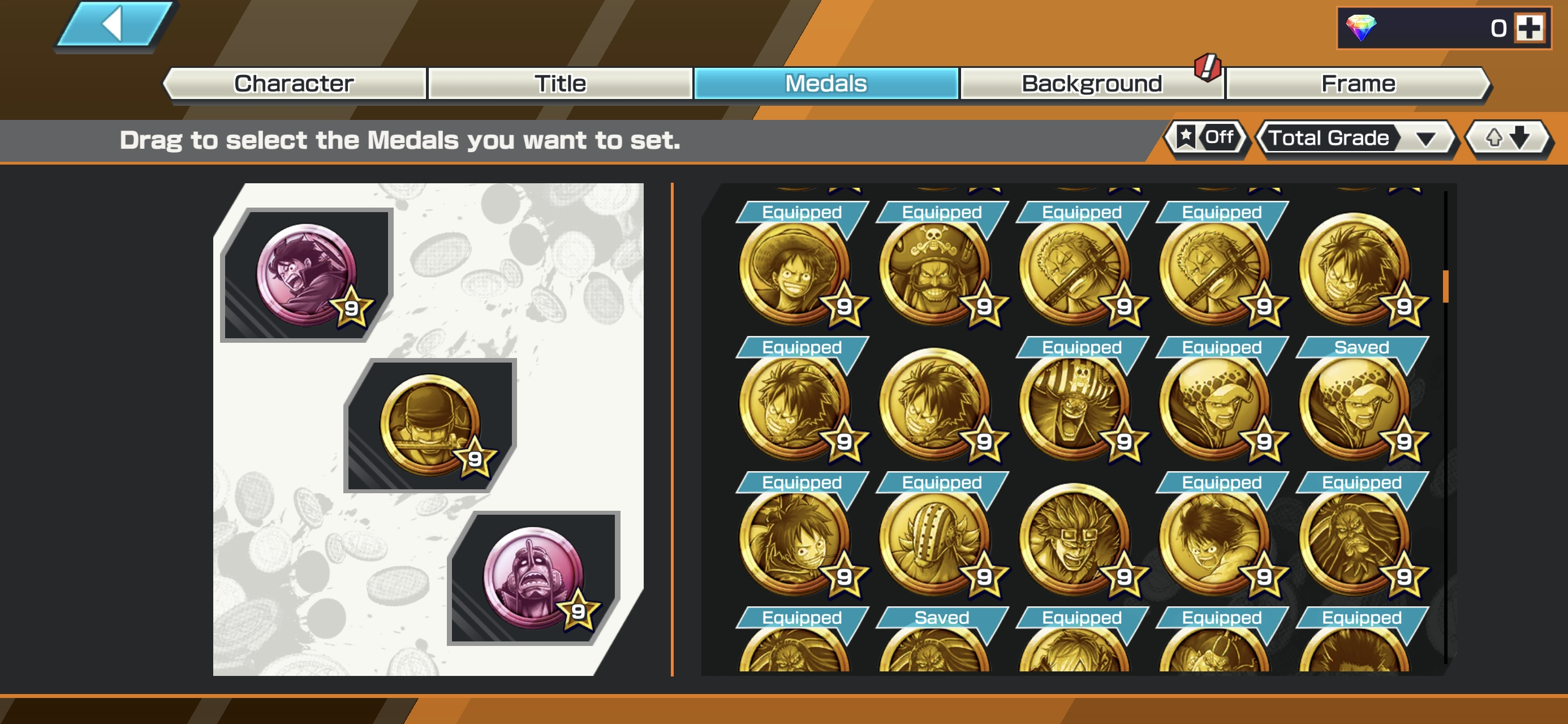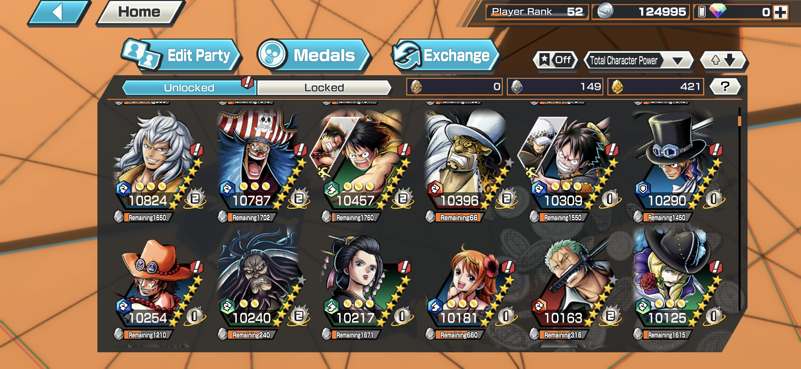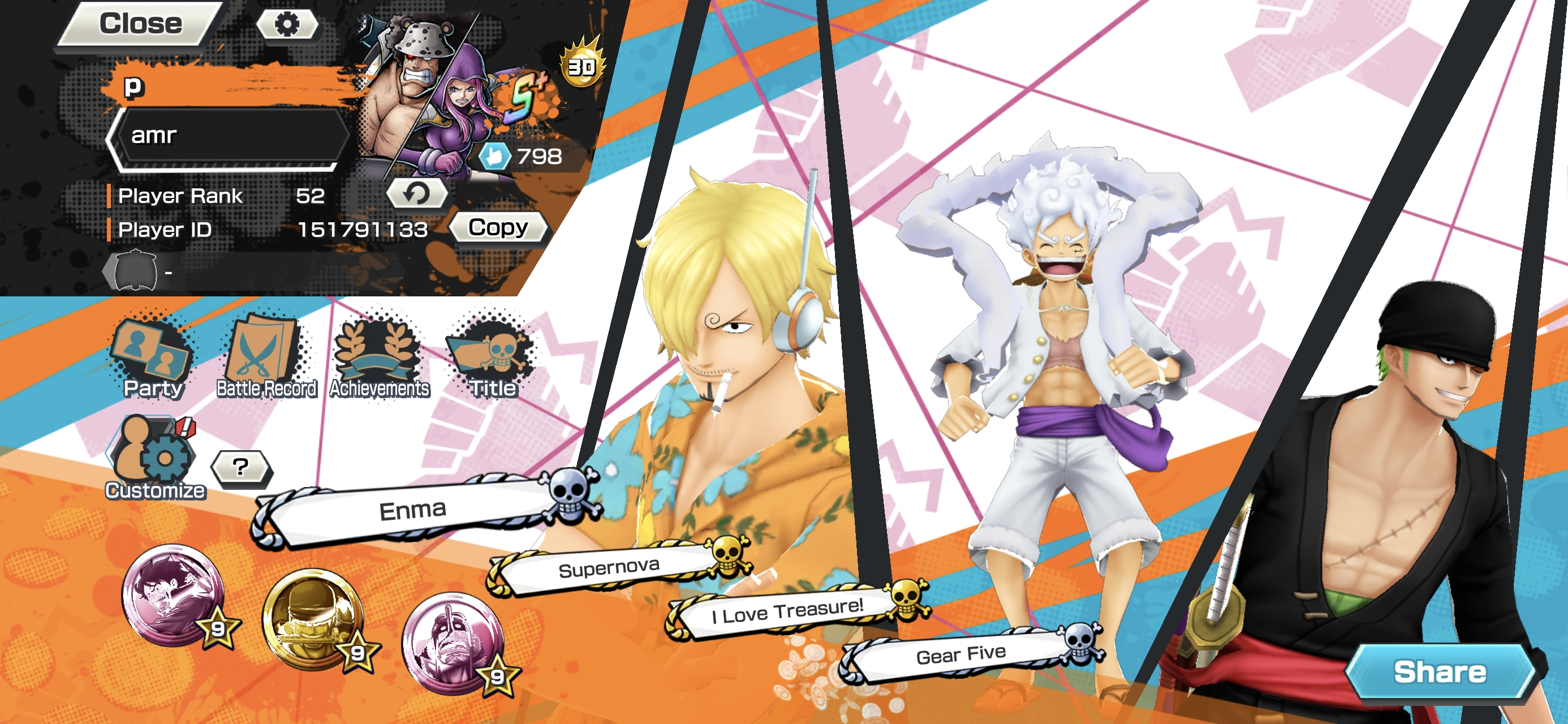 HB 30 ⸱ 4 Ex Meta Max ⸱ Gear 5 Luffy Max ⸱ Oni Zoro Max ⸱ Newgate Max ⸱ Luffy Max ⸱ Trafalgar law Max ⸱ Eustas Kid Max ⸱ Goldenweek Max ⸱ Charlotte Pudding Max ⸱ Support 152 ⸱ Good Medal ⸱ Gems ⸱ Many Medal Material ⸱ B465
