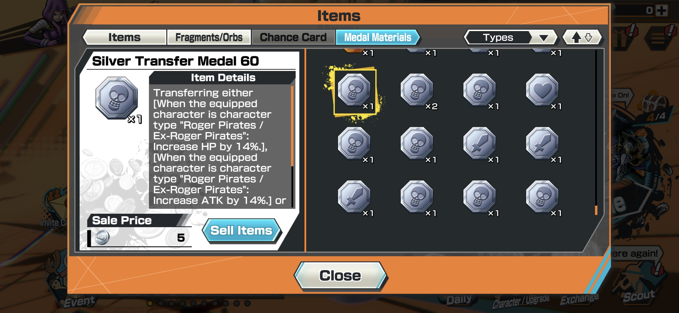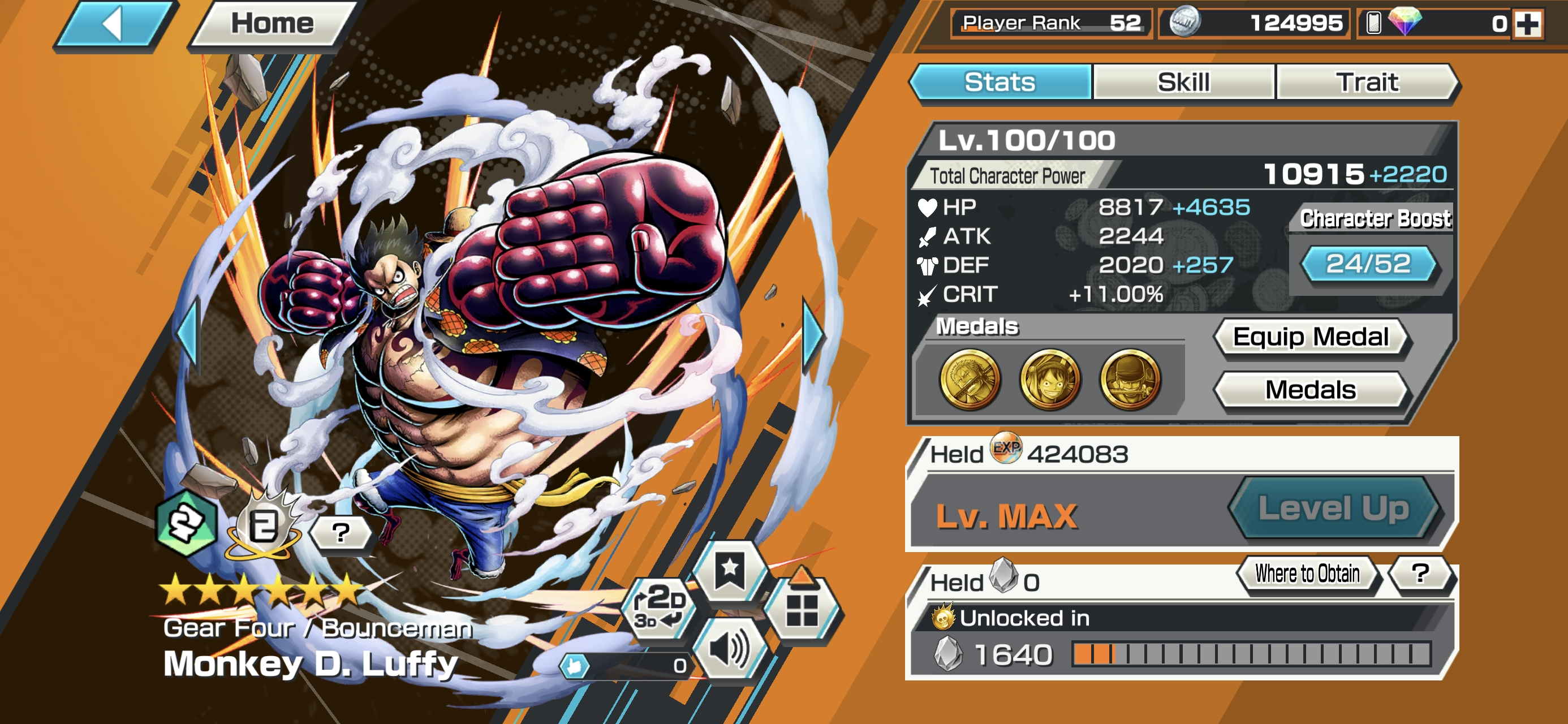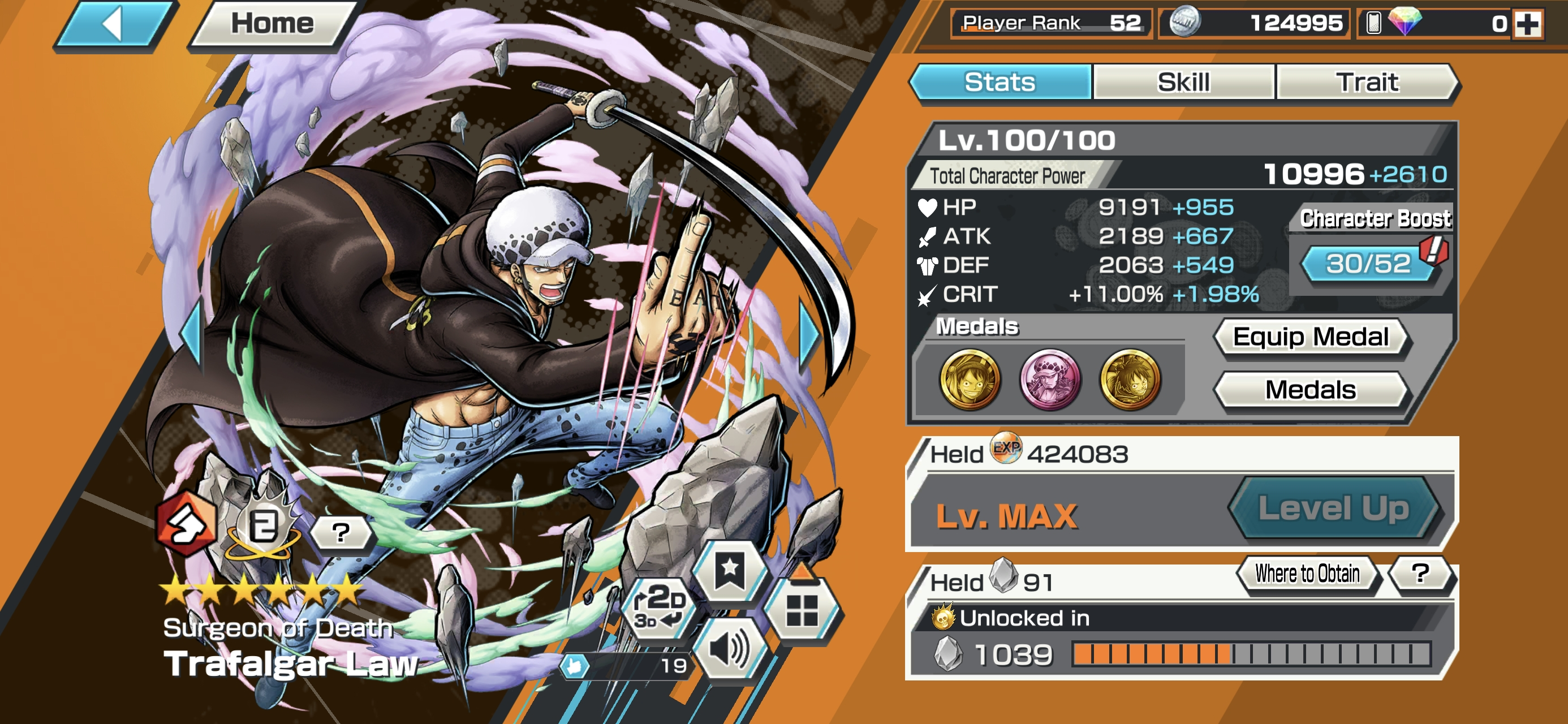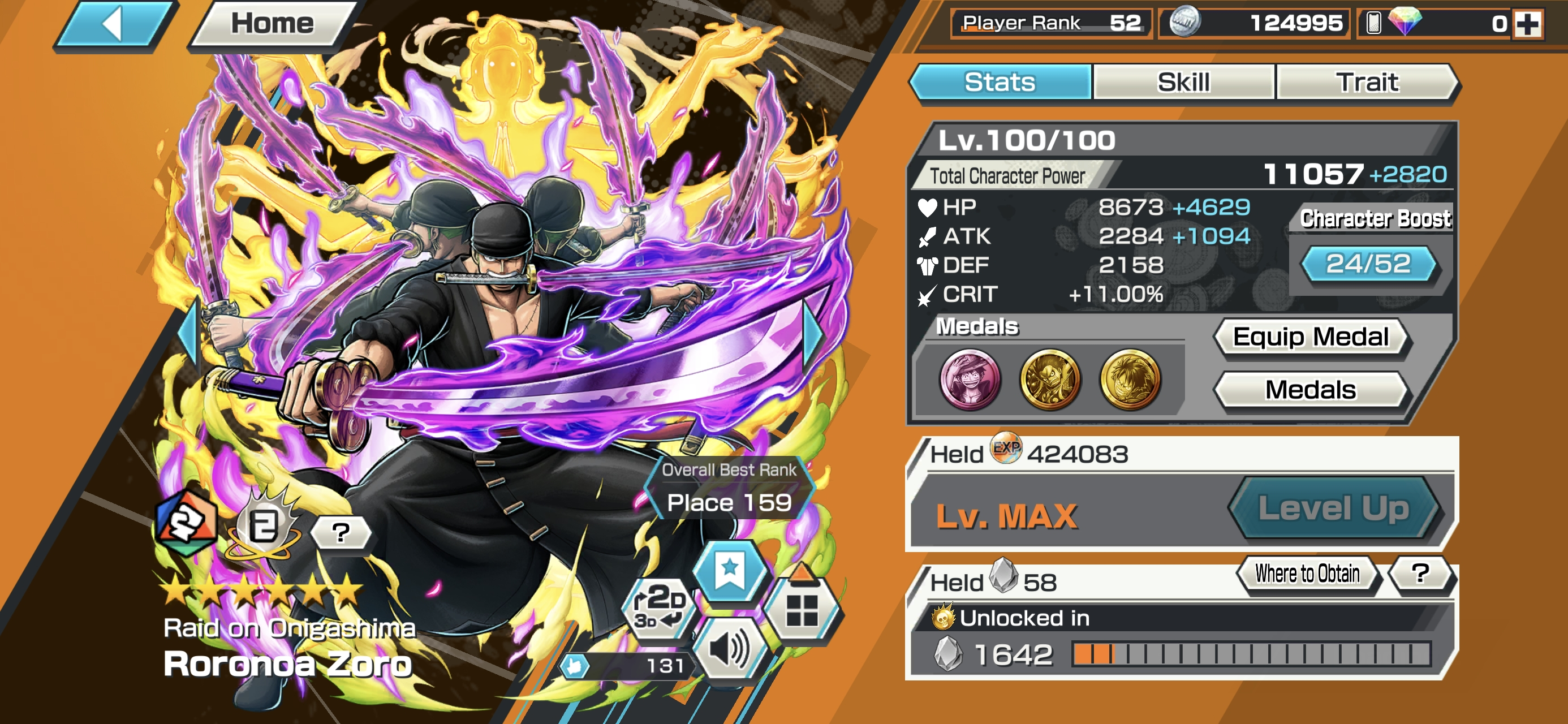 HB 30 ⸱ 4 Ex Meta Max ⸱ Gear 5 Luffy Max ⸱ Oni Zoro Max ⸱ Newgate Max ⸱ Luffy Max ⸱ Trafalgar law Max ⸱ Eustas Kid Max ⸱ Goldenweek Max ⸱ Charlotte Pudding Max ⸱ Support 152 ⸱ Good Medal ⸱ Gems ⸱ Many Medal Material ⸱ B465