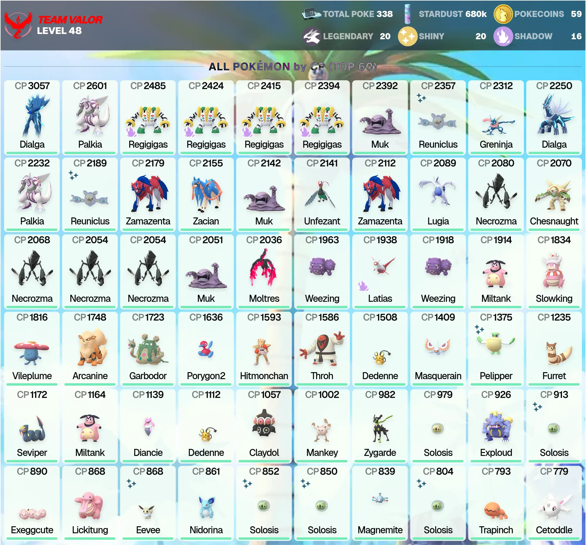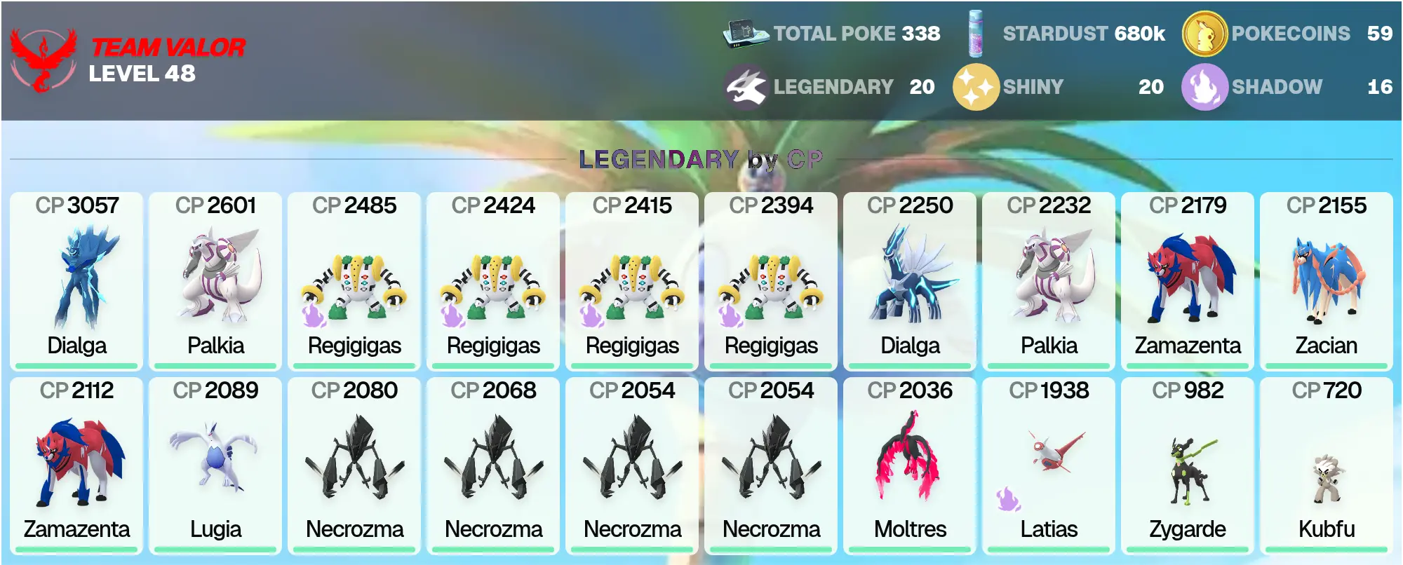 👑 POGO 🏆 Zacian ⚔️ | Regigigas 🪨 | Lugia 🌬️ | Galarian Moltres 🔥 | Legendary: 20 🌟 | Lugia 🌬️ | Origin Dialga 3K ⏳ | Shiny: 20 ✨ | Palkia 🌊 | Zamazenta 🛡️ | [MG] | PG-HFMUK !MKG016365