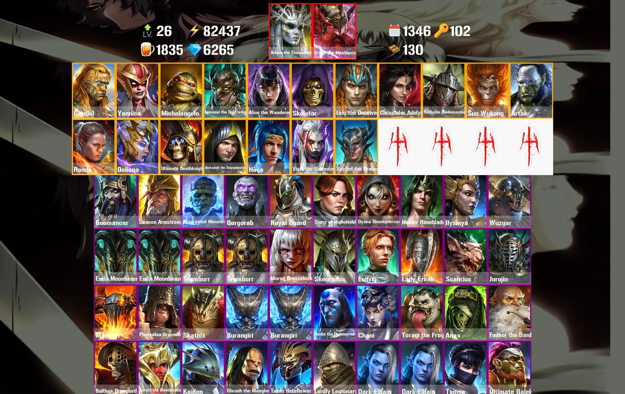 1346 Days 82.4k Energy [Mythical Starter] Arbais the Stonethorn ⸱ Frolni the Mechanist ⸱ Cardiel ⸱ Yannica ⸱ Michelangelo ⸱ Leminisi the Gold-wing ⸱ Alice the Wanderer ⸱ Geomancer ⸱ Deacon Armstrong ⸱ 53.8m Silver ⸱ 6.3k Gems