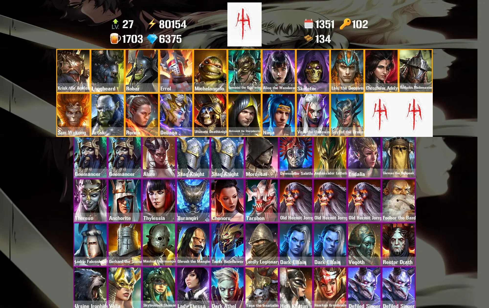 1351 Days 80.2k Energy [Mythical Starter] Ash'nar Dragonsoul ⸱ Krisk the Ageless ⸱ Longbeard ⸱ Robar ⸱ Errol ⸱ Michelangelo ⸱ Geomancer ⸱ Geomancer ⸱ 52.2m Silver ⸱ 6.4k Gems