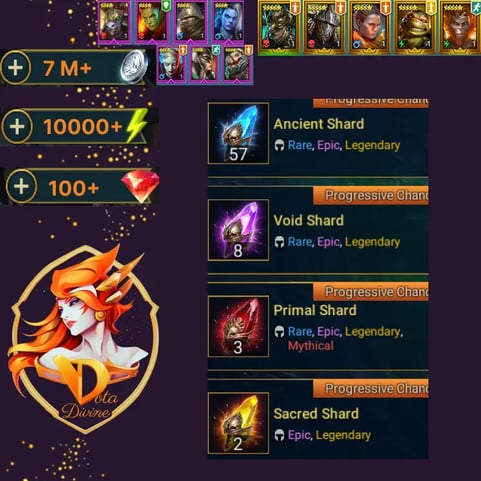 ๐ Best Combo โธฑ Siegfrund the Nephilim + Duchess Lilitu ๐ Skorid ๐ 19 LEG ๐ 58 Epic ๐ 42164 Energy + 8779 Gems ๐ Ninja + Sun Wukong ๐ Sinesha + Thenasil + Venomage ๐