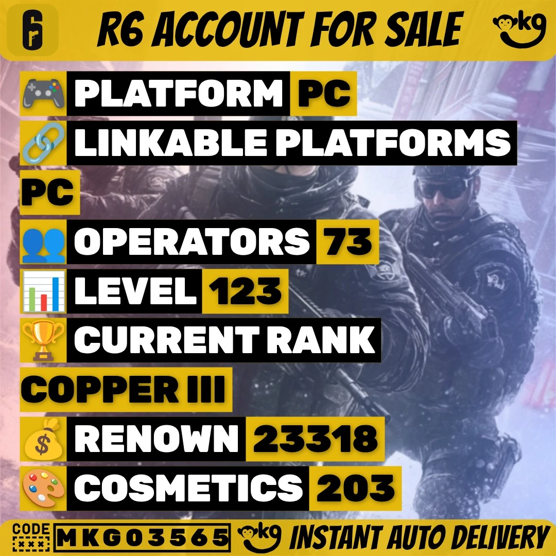 π― γ UPLAY γ Level 123 β΄οΈ 13 π BLACK ICE + 203 π¨ SKINS + π§± Copper 3 β΄οΈ 73 π₯ OPERATORS + π° 23,318 Renown + βοΈ Ready Ranked + π Full Access !MKG03565