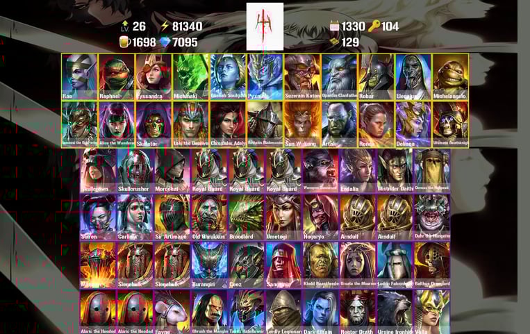 1330 Days 81.3k Energy Rae ⸱ Raphael ⸱ Lyssandra ⸱ Michinaki ⸱ Gliseah Soulguide ⸱ Skullcrown ⸱ Skullcrusher ⸱ 52.4m Silver ⸱ 7.1k Gems