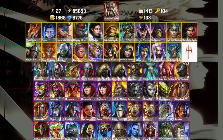1413 Days 85.7k Energy [Mythical Starter] Siegfrund the Nephilim ⸱ Teumesia ⸱ Saito ⸱ Jetni the Giant ⸱ Mighty Ukko ⸱ Sethallia ⸱ Demytha ⸱ Skullcrusher ⸱ 54.0m Silver ⸱ 6.8k Gems
