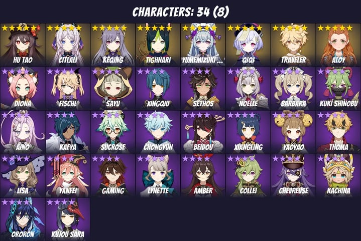 ⚡Asia⚡ AR 50 💎 34 Characters 💎 Hu Tao 💎 Citlali 💎 Keqing 💎 Tighnari 💎 Yumemizuki Mizuki 💎 Qiqi 💎 Aloy