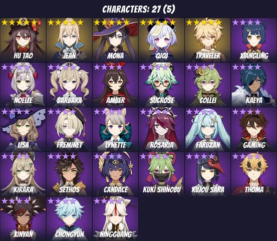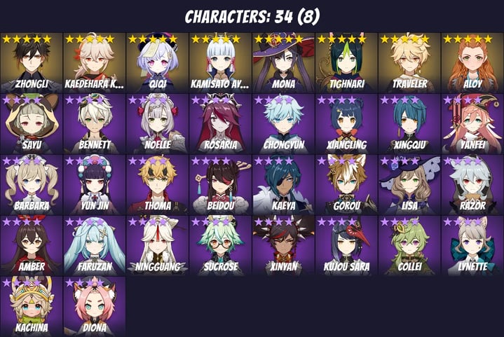 ⚡Asia⚡ AR 53 💎 34 Characters 💎 Zhongli 💎 Kaedehara Kazuha 💎 Qiqi 💎 Kamisato Ayaka 💎 Mona 💎 Tighnari 💎 Aloy
