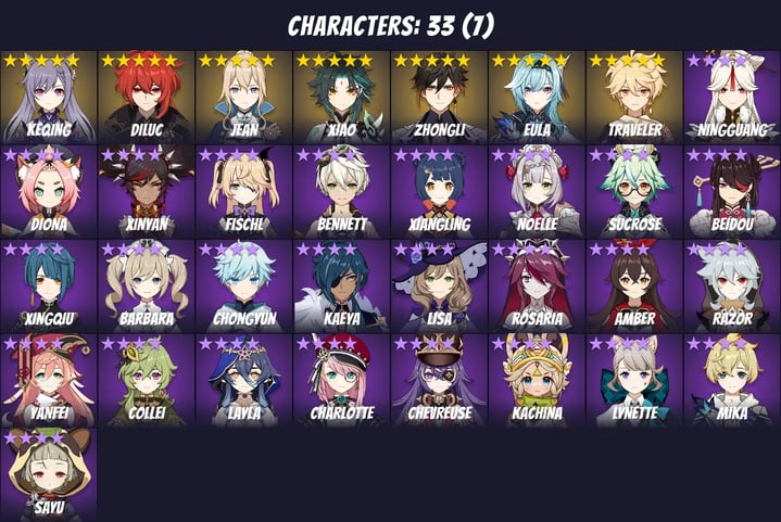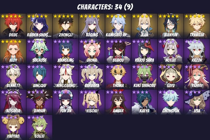 ⚡Asia⚡ AR 55 💎 34 Characters 💎 Diluc 💎 Raiden Shogun 💎 Zhongli 💎 Keqing 💎 Kamisato Ayato 💎 Jean 💎 Xianyun