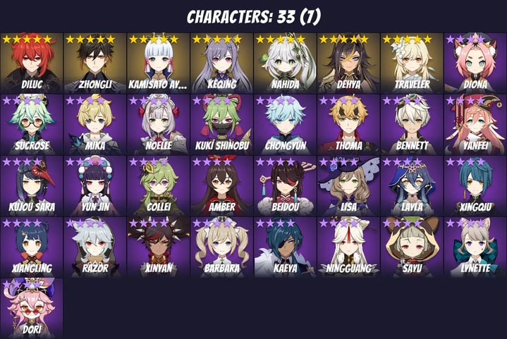 ⚡Asia⚡ AR 54 💎 33 Characters 💎 Diluc 💎 Zhongli 💎 Kamisato Ayaka 💎 Keqing 💎 Nahida 💎 Dehya