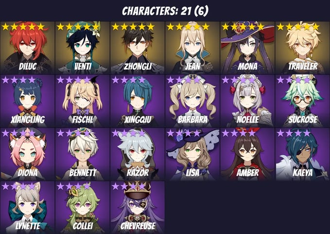 ⚡North America⚡ AR 41 💎 21 Characters 💎 Diluc 💎 Venti 💎 Zhongli 💎 Jean 💎 Mona