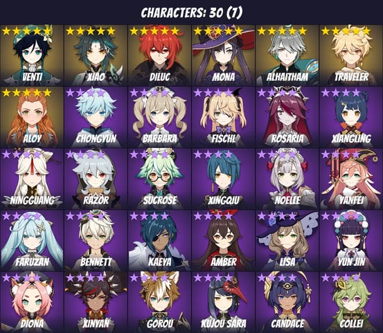 ⚡Asia⚡ AR 52 💎 30 Characters 💎 Venti 💎 Xiao 💎 Diluc 💎 Mona 💎 Alhaitham 💎 Aloy