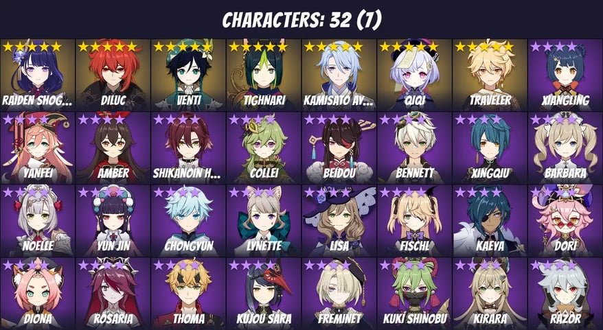 ⚡Asia⚡ AR 46 💎 32 Characters 💎 Raiden Shogun 💎 Diluc 💎 Venti 💎 Tighnari 💎 Kamisato Ayato 💎 Qiqi