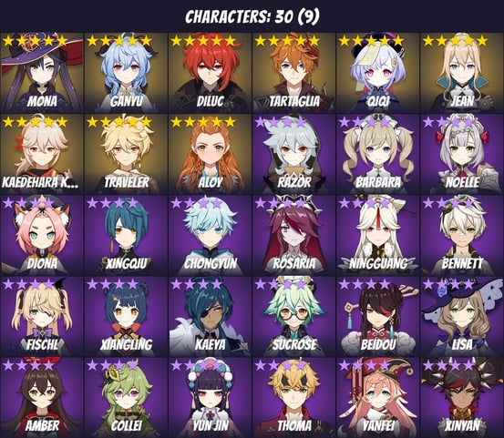 ⚡Asia⚡ AR 53 💎 30 Characters 💎 Mona 💎 Ganyu 💎 Diluc 💎 Tartaglia 💎 Qiqi 💎 Jean 💎 Kaedehara Kazuha