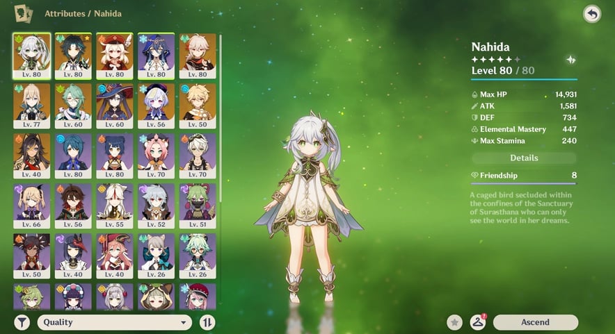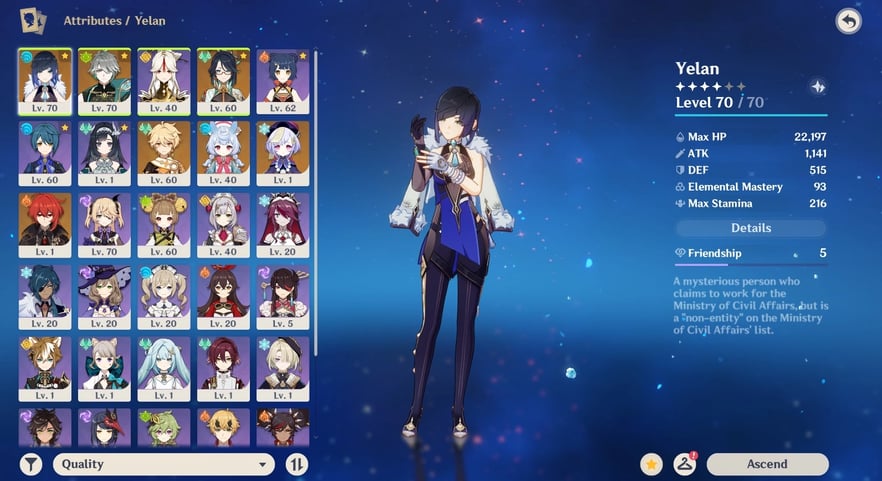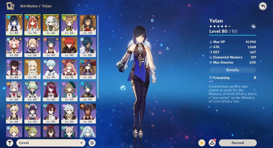 EU AR53 | 5 stars*7 Dehya(C1) | Diluc(C1) | Mona | Nahida | Nilou | Yelan | Silvershower Heartstrings | lots of 4* characters and weapons
