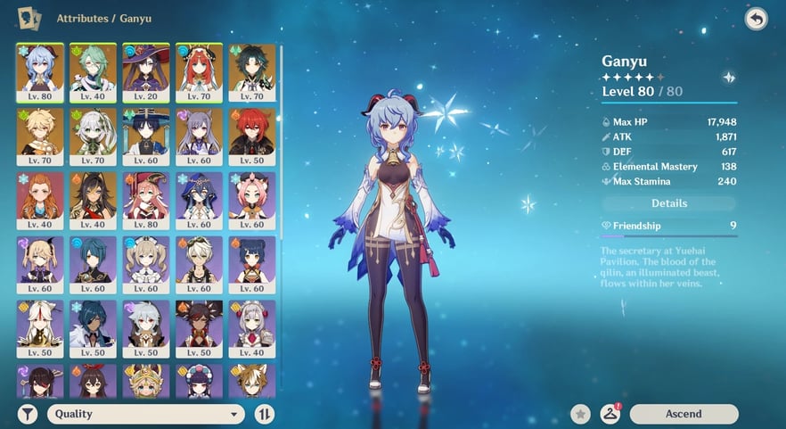 EU AR52 | 5 stars*7 Diluc(C1) | Ganyu | Mona(C1) | Nahida | Xianyun | Crane's Echoing Call | Skyward Blade | lots of 4* characters and weapons