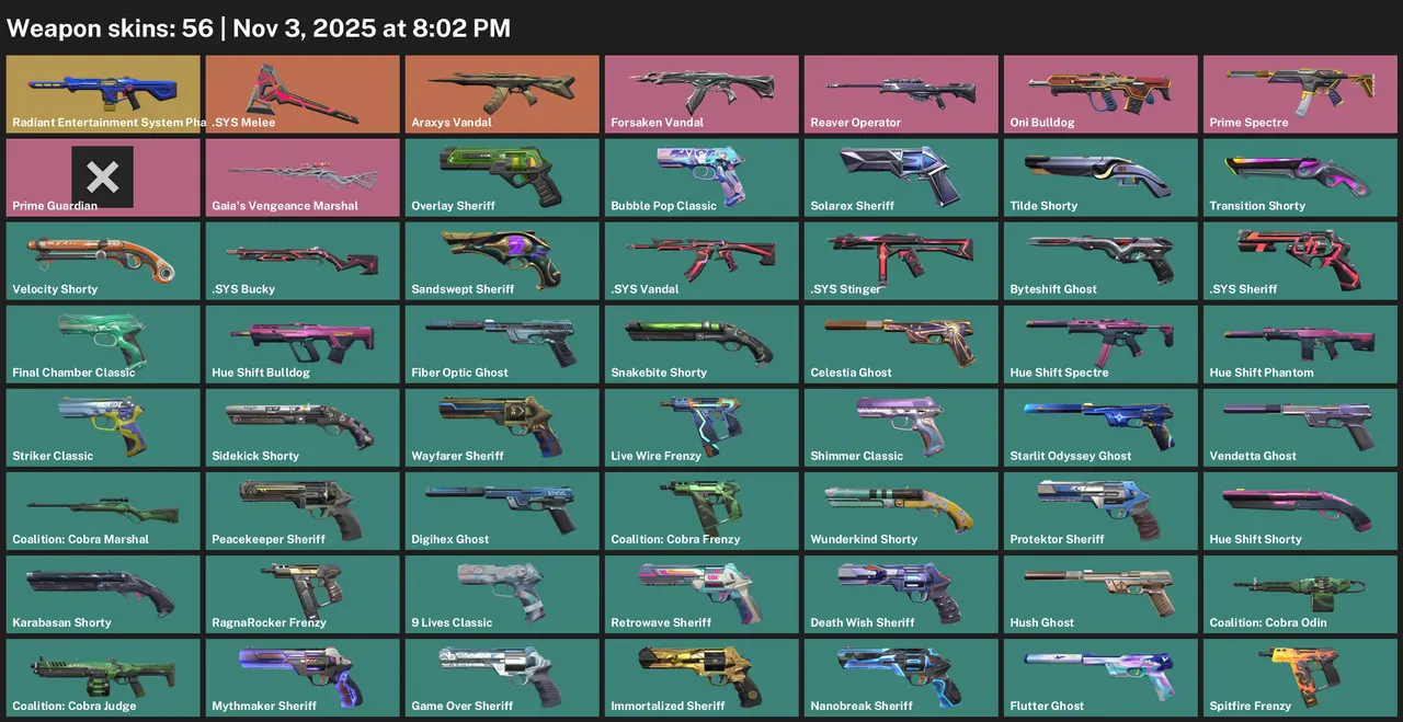 [AP] ๐ฅ | 56 Skins โข Radiant Entertainment System Phantom + .SYS Melee + Araxys Vandal + Forsaken Vandal โข 15,800 VP โข Full Access