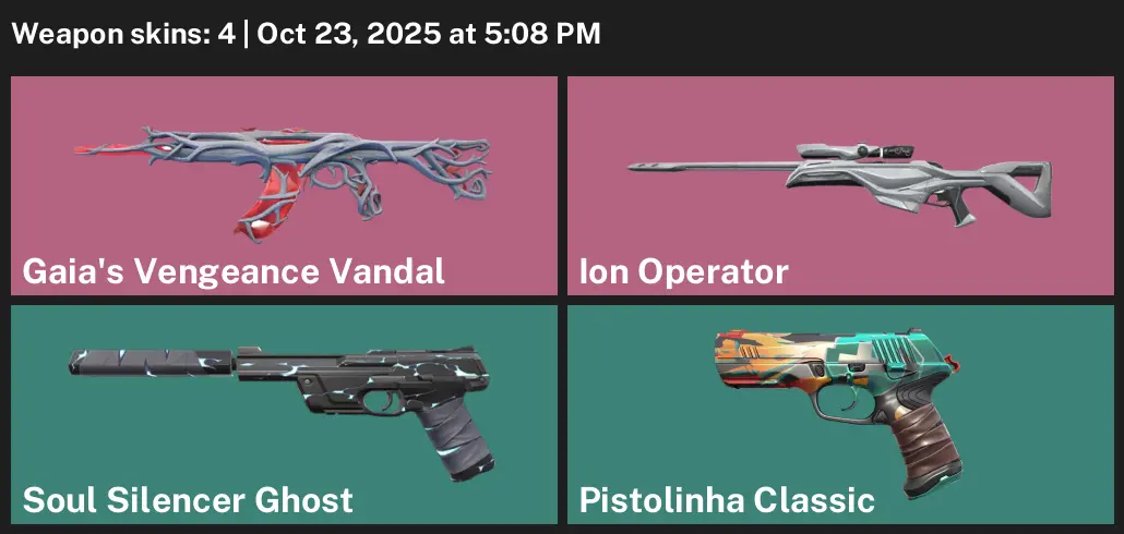 😡 AP 🍋🟩 Unranked 4 Skins 🧉 525 VP 🛟 13 Agents 📟 Value: 3550 VP 🐸 Gaia's Vengeance Vandal 🚕 Ion Operator 🧾 Soul Silencer Ghost 🚉 Pistolinha Classic