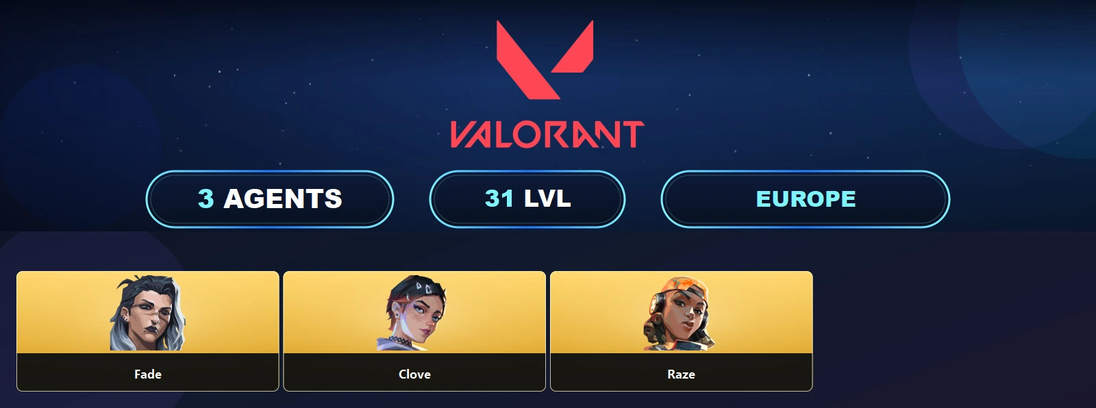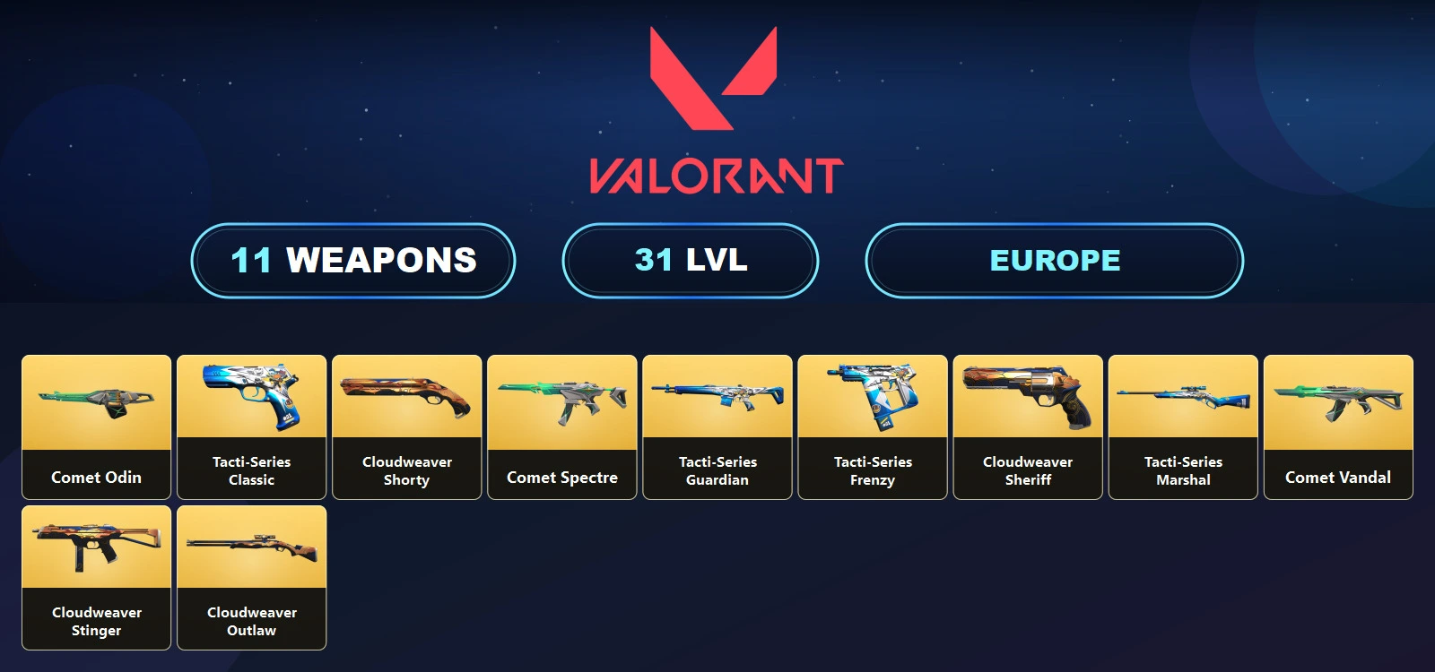 EU ๐ 11 Skins ๐ฅช 31 Level ๐ฉ Comet Vandal ๐ฅ Comet Odin ๐ Tacti-Series Classic ๐ช Cloudweaver Shorty ๐ Comet Spectre ๐ Tacti-Series Guardian ๐ Tacti-Series Frenzy ๐ช Unranked ๐ 3 Agents